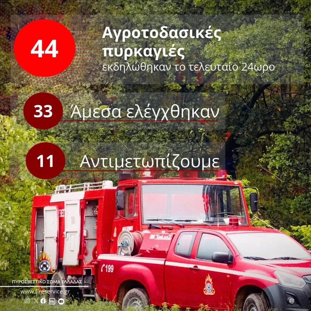 Από χθες το απόγευμα στις 18:00 έως σήμερα στις 18:00 εκδηλώθηκαν 44 αγροτοδασικές πυρκαγιές, από τις οποίες οι 33 αντιμετωπίστηκαν άμεσα, στο αρχικό τους στάδιο, ενώ οι πυροσβεστικές δυνάμεις αντιμετωπίζουν ακόμη 11.