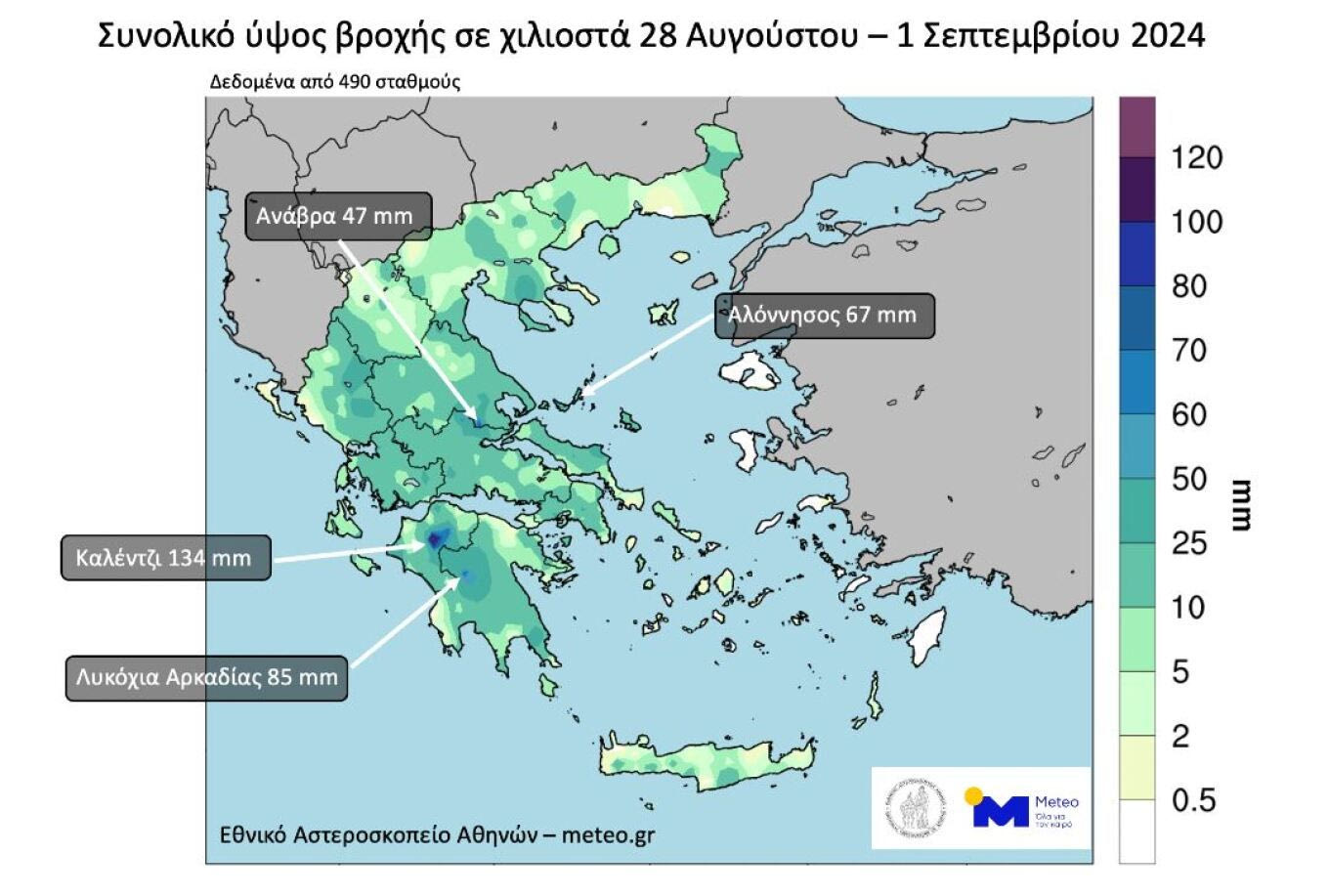 Βροχοπτώσεις στο μεγαλύτερο μέρος της χώρας κατέγραψε το δίκτυο μετεωρολογικών σταθμών του Εθνικού Αστεροσκοπείου Αθηνών/meteo.gr το διάστημα από την Τετάρτη 28 Αυγούστου μέχρι το απόγευμα της Κυριακής 1 Σεπτεμβρίου 2024.