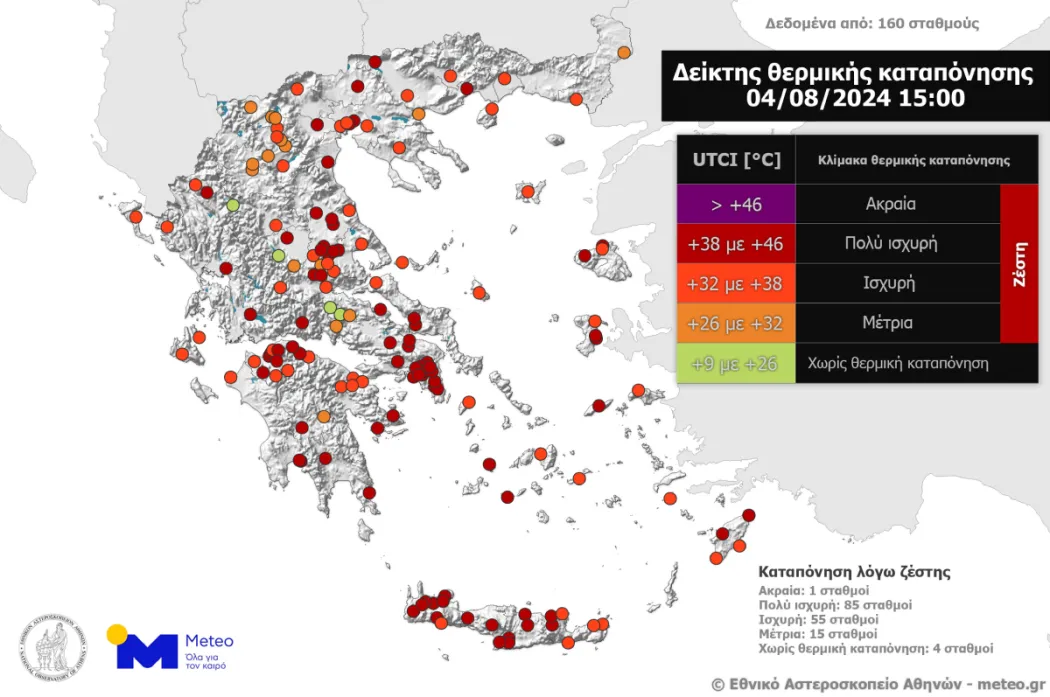 Στην παρακάτω εικόνα παρουσιάζεται η θερμική καταπόνηση στις περιοχές 160 επιλεγμένων μετεωρολογικών σταθμών του δικτύου του meteo.gr / Εθνικού Αστεροσκοπείου Αθηνών. Όπως προκύπτει από τις καταγραφές των σταθμών αυτών, σε 85 από αυτούς, η θερμική καταπόνηση ήταν «Πολύ Ισχυρή» ενώ σε 1 ήταν «Ακραία». Το συνολικό ποσοστό σταθμών με «Πολύ Ισχυρή» ή «Ακραία» θερμική καταπόνηση ήταν περίπου 54%.
