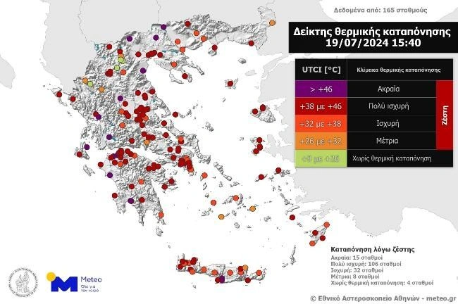 Όπως προκύπτει από τις καταγραφές των σταθμών αυτών, στις περιοχές 106 από αυτούς, η θερμική καταπόνηση ήταν «Πολύ Ισχυρή» ενώ σε 15 ήταν «Ακραία». Το συνολικό ποσοστό σταθμών με «Πολύ Ισχυρή» ή «Ακραία» θερμική καταπόνηση ήταν περίπου 73%.