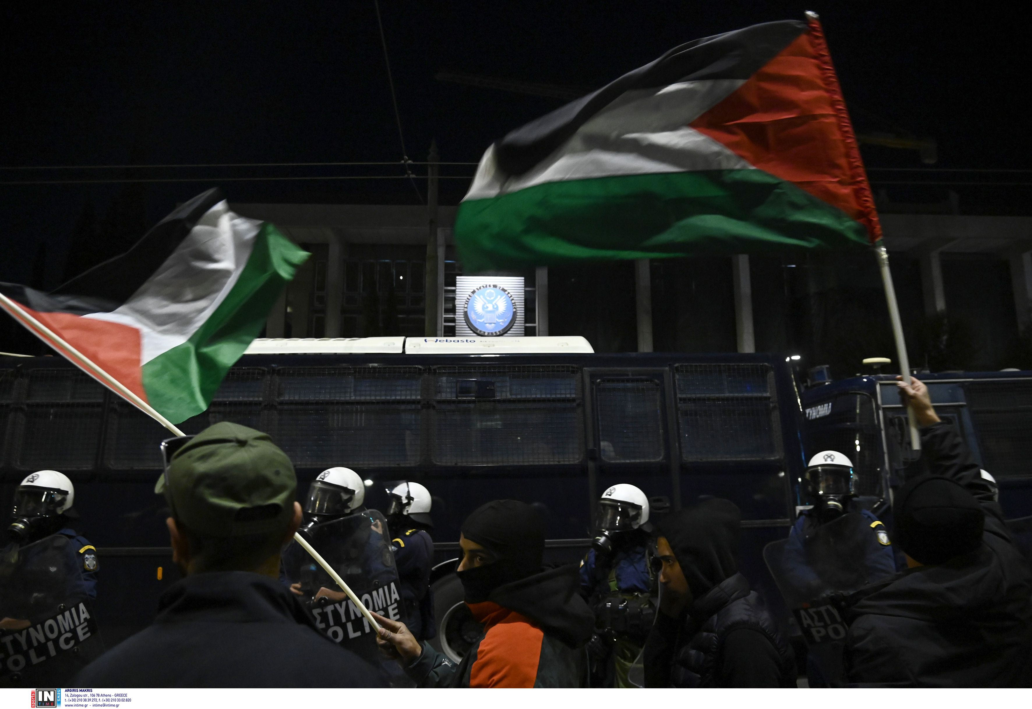 Λίγο μετά τις 20:30 τα μπλοκ φοιτητών, σωματείων, κοινωνικών φορέων και κομμάτων έφτασαν το ένα μετά το άλλο στη λεωφόρο Κηφισίας, έξω από την πρεσβεία του Ισραήλ, φωνάζοντας αντιπολεμικά συνθήματα. Μέλη της παλαιστινιακής κοινότητας και υποστηρικτές ύψωσαν σημαίες της χώρας και ζήτησαν την κατάπαυση του πυρός.