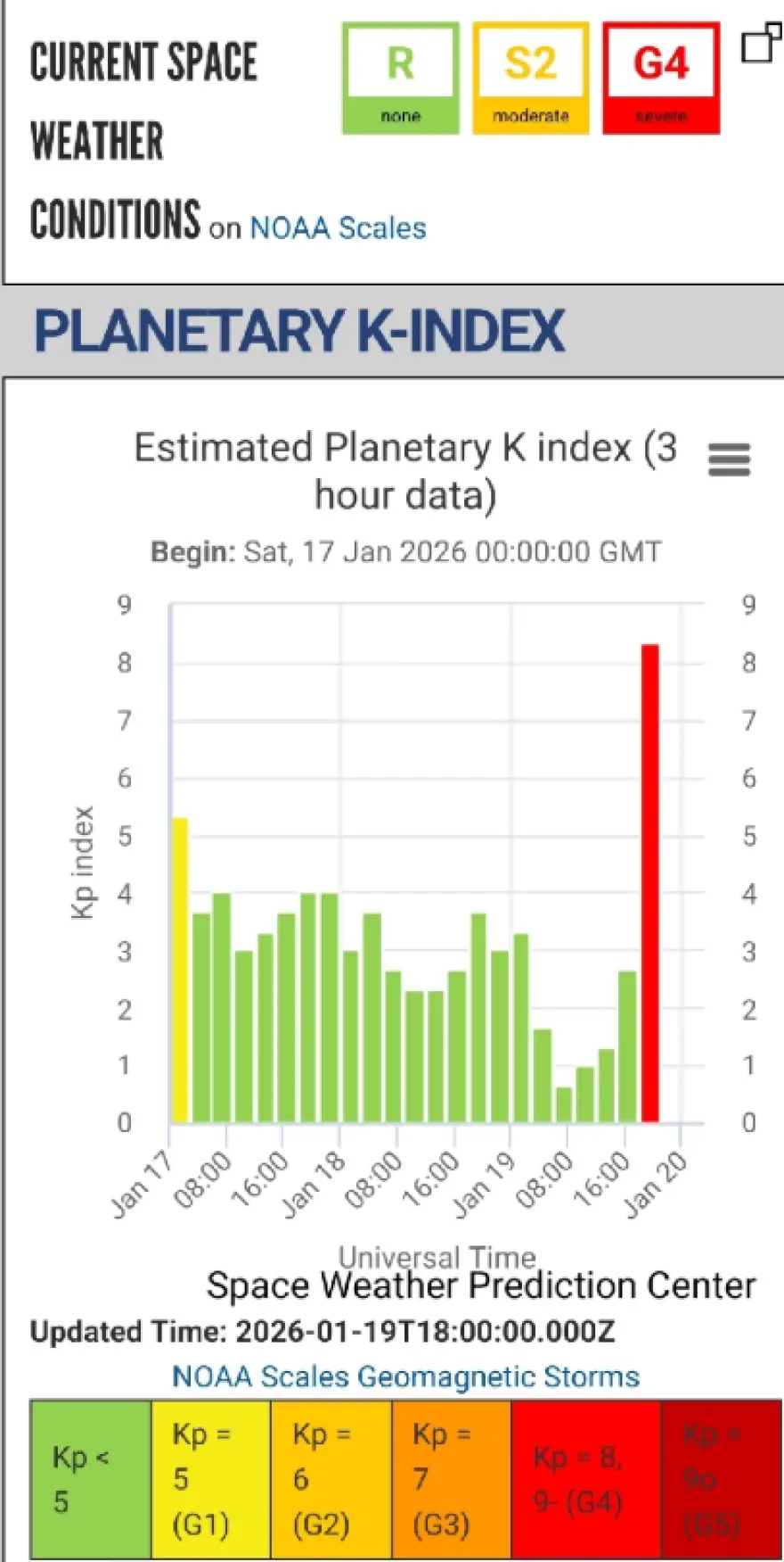 «Σήμερα έχουμε υψηλά επίπεδα ηλιακών πρωτονίων (ηλεκτρόνια/πρωτόνια/φορτισμένα σωματίδια με υψηλή ενέργεια) με δυνατότητα να διεισδύουν βαθύτερα στην άνω ατμόσφαιρα, ιδιαίτερα κοντά στους πόλους. Αυτό έχει επιβεβαιωθεί από τη μετρήση των GOES και ανακοινώθηκε από το NOAA/Space Weather Prediction Center. Παράλληλα έχουμε G4 Severe γεωμαγνητική καταιγίδα σε εξέλιξη λόγω άφιξης CME που εκτοξεύτηκε από ηλιακή έκλαμψη X1.9 στις 18/1/2026, και η οποία επηρεάζει την αλληλεπίδραση του ηλιακού ανέμου με το μαγνητικό πεδίο της Γης.