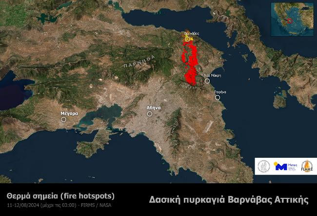 Πρόκειται για δορυφορικές παρατηρήσεις υψηλής ανάλυσης (375 m) από το σύστημα FIRMS (Fire Information for Resource Management System) της NASA που δείχνουν τα θερμά σημεία που ανιχνεύθηκαν από δορυφόρους πολικής τροχιάς κατά τις πρώτες πρωινές ώρες (03:00, Εικόνα 1) και το μεσημέρι (13:00, Εικόνα 2) της Δευτέρας 12 Αυγούστου 2024.