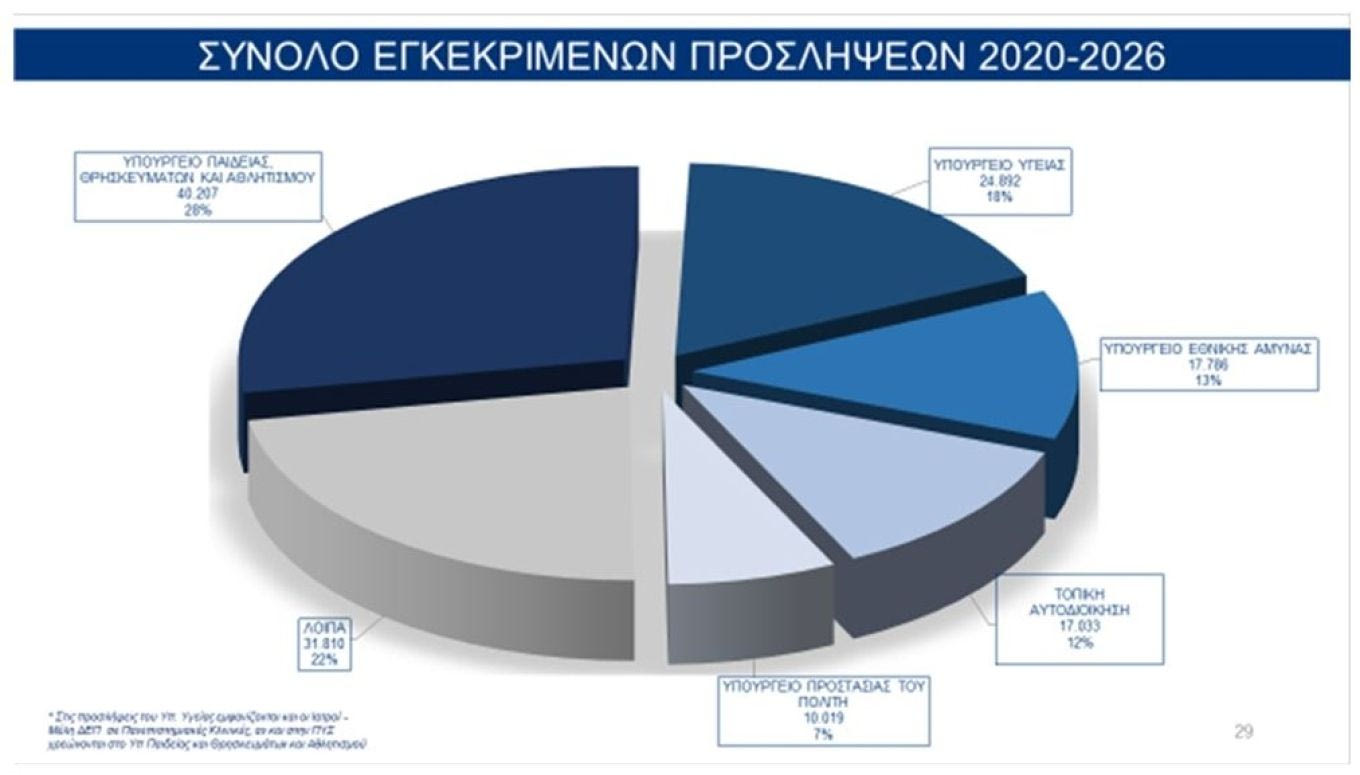Σημειώνεται ότι ο προγραμματισμός των 19.489 προσλήψεων στο Δημόσιο για το 2026, αποτελεί συνέχεια των 122.203 προσλήψεων που έχουν εγκριθεί για τα έτη 2020 έως 2025 και άρα συνολικά 141.692 για το σύνολο της εξαετίας.