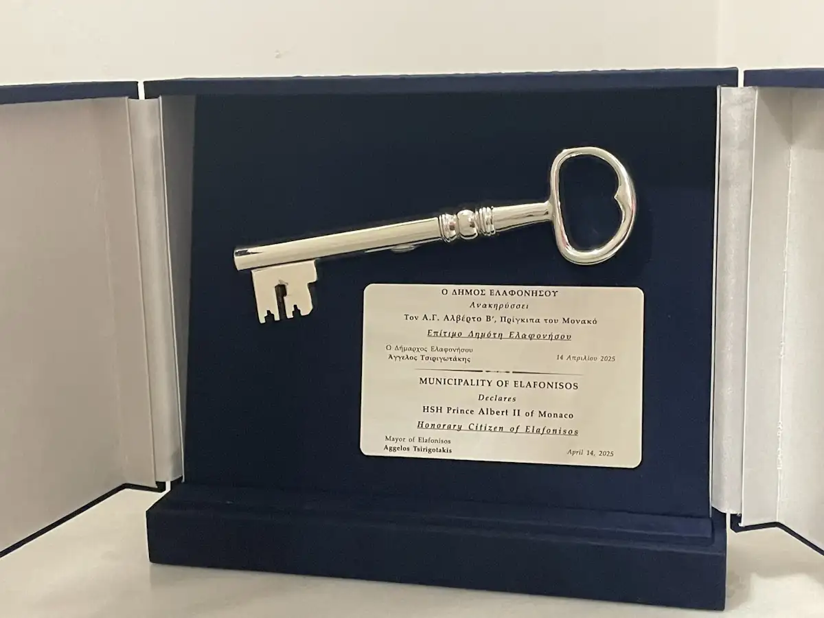 Από τη δική του πλευρά ο Πρίγκιπας Αλβέρτος του Μονακό έδωσε στον δήμαρχο Ελαφονήσου – ως δείγμα ευγνωμοσύνης – τιμητικό δώρο με το εθνόσημο του Πριγκιπάτου.