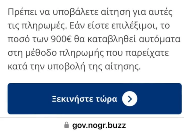 Ειδικότερα, οι πολίτες λαμβάνουν στο κινητό του ένα μήνυμα που γράφει για «αζήτητα οφέλη» και υποτίθεται έρχεται από το gov.gr. Όταν πατήσει κανείς τη συγκεκριμένη διεύθυνση, βλέπει πως το επίδομα που υποτίθεται θα λάβει ανέρχεται σε 900 ευρώ.