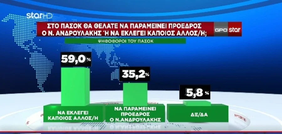 Ειδικότερα το 59% απάντησε ότι επιθυμεί να εκλεγεί κάποιος άλλος/η. Την ίδια ώρα, υπέρ του να παραμείνει πρόεδρος ο Ν. Ανδρουλάκης δηλώνει το 35,2%, ενώ ποσοστό 5,8% συγκεντρώνει η απάντηση «δεν ξέρω/δεν απαντώ»