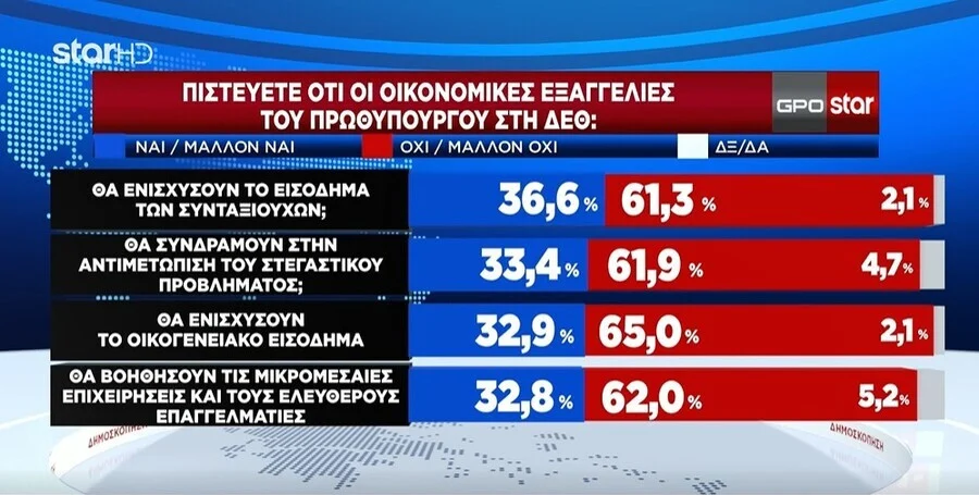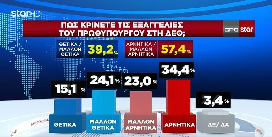 Όσον αφορά τις εξαγγελίες του πρωθυπουργού στη ΔΕΘ το 39,2% τις αξιολογεί θετική ή μάλλον θετικά και το 57,4% αρνητικά ή μάλλον αρνητικά.
