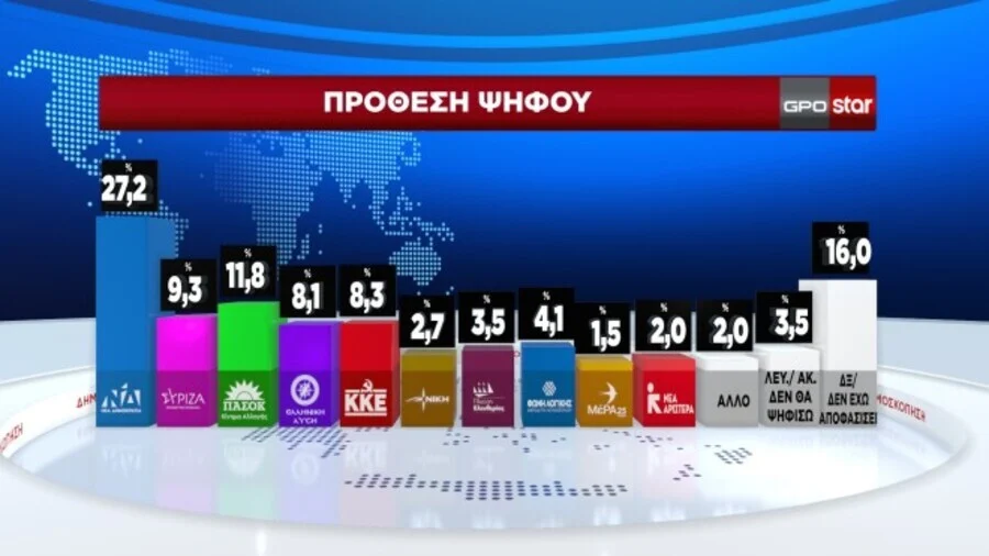 Στην πρόθεση ψήφου το κυβερνών κόμμα εξασφαλίζει προβάδισμα 15,4% έναντι του ΠΑΣΟΚ ενώ ο ΣΥΡΙΖΑ ακολουθεί στην τρίτη θέση. Τα ποσοστά συγκεκριμένα είναι: Νέα Δημοκρατία 27,2%, ΠΑΣΟΚ 11,8%, ΣΥΡΙΖΑ 9,3%, ΚΚΕ 8,3%, Ελληνική Λύση 8,1%, Φωνή Λογικής 4,1%, Πλεύση Ελευθερίας 3,5%, ΝΙΚΗ 2,7% και Νέα Αριστερά 2%.