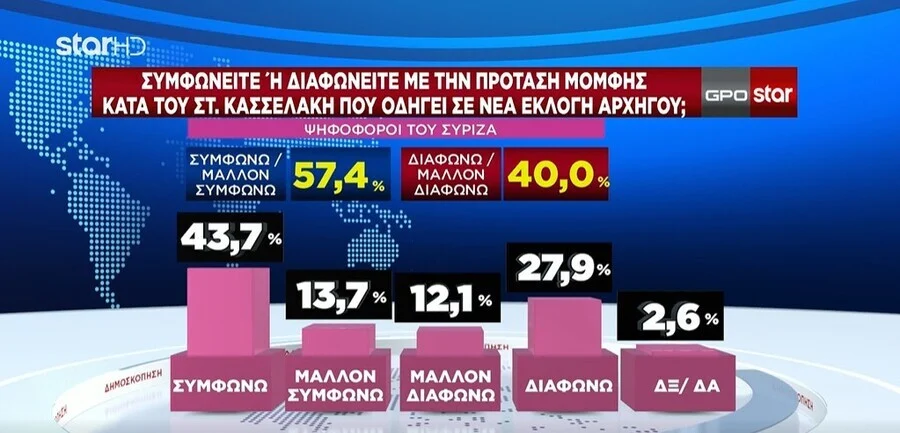 Στο ερώτημα «συμφωνείτε ή διαφωνείτε με την πρόταση μομφής κατά του Στ. Κασσελάκη που οδηγεί σε νέα εκλογή αρχηγού»: