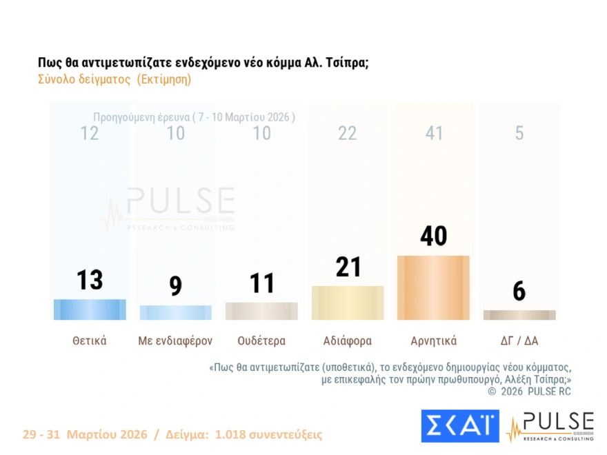 Στο 31% κατέγραψε η Pulse τη ΝΔ στην εκτίμηση ψήφου, στη μέτρηση που παρουσιάστηκε στο κεντρικό δελτίο του Σκάι. Σημειώνεται ότι το γκάλοπ πραγματοποιήθηκε από 29 ως 31 Μαρτίου, οπότε δεν συμπεριέλαβε τις πρώτες εντυπώσεις από τη νέα δικογραφία για τον ΟΠΕΚΕΠΕ.