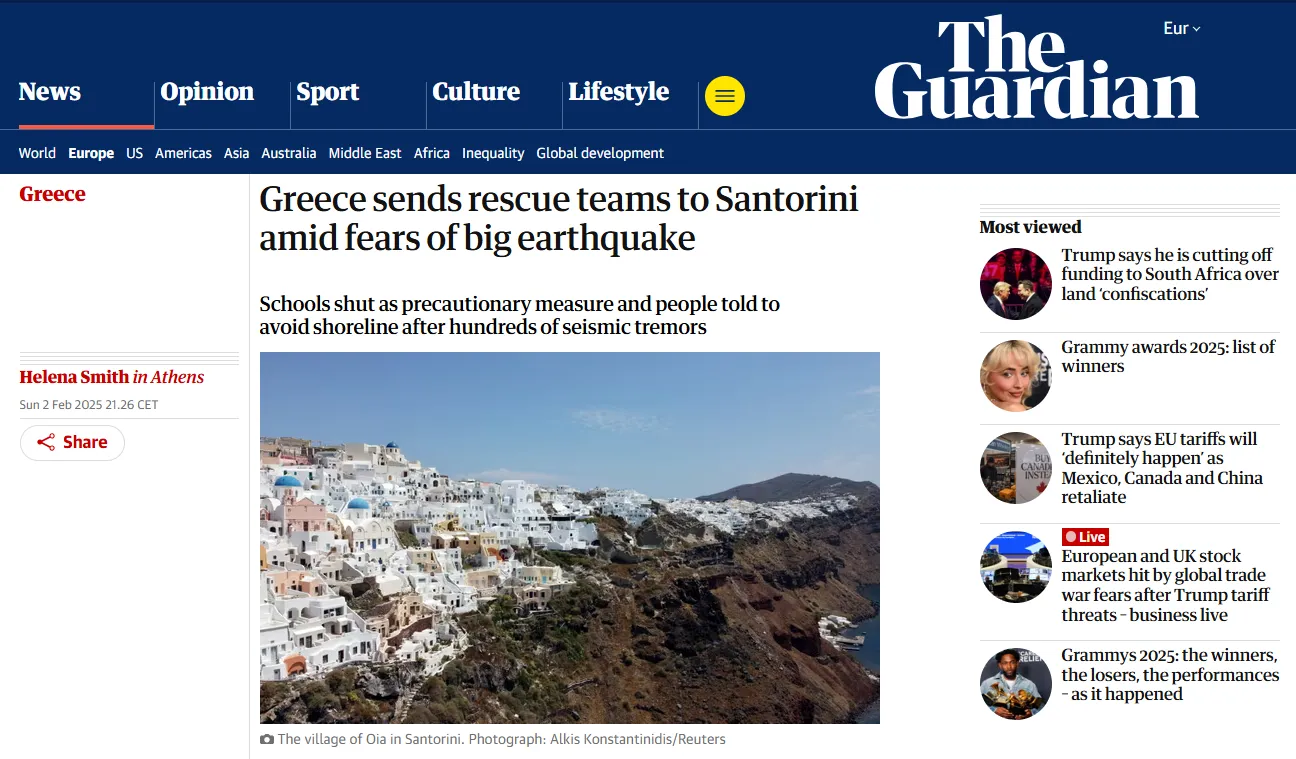 «Η Ελλάδα στέλνει ομάδες διάσωσης στη Σαντορίνη υπό το φόβο μεγάλου σεισμού», είναι ο τίτλος άρθρου που δημοσιεύεται στον βρετανικό Guardian, στο οποίο μάλιστα γίνεται και λόγος… για τσουνάμι.