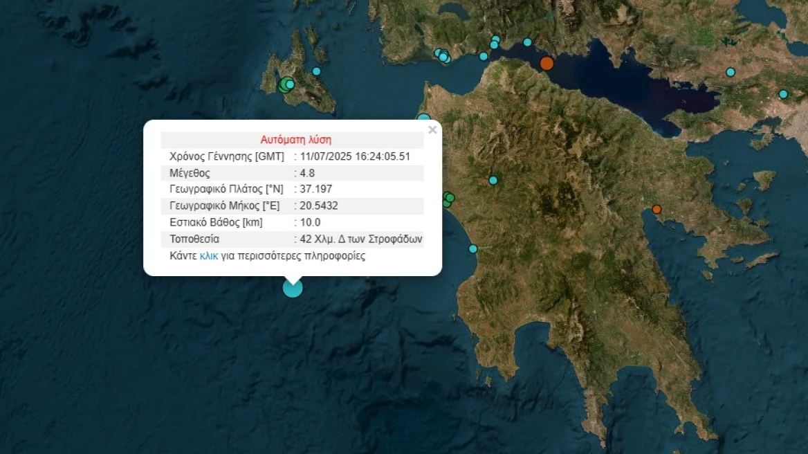 Σεισμική δόνηση μεγέθους 4,8 Ρίχτερ στο θαλάσσιο χώρο, δυτικά της Πελοποννήσου σημειώθηκε στις 19.24 της Παρασκευής.