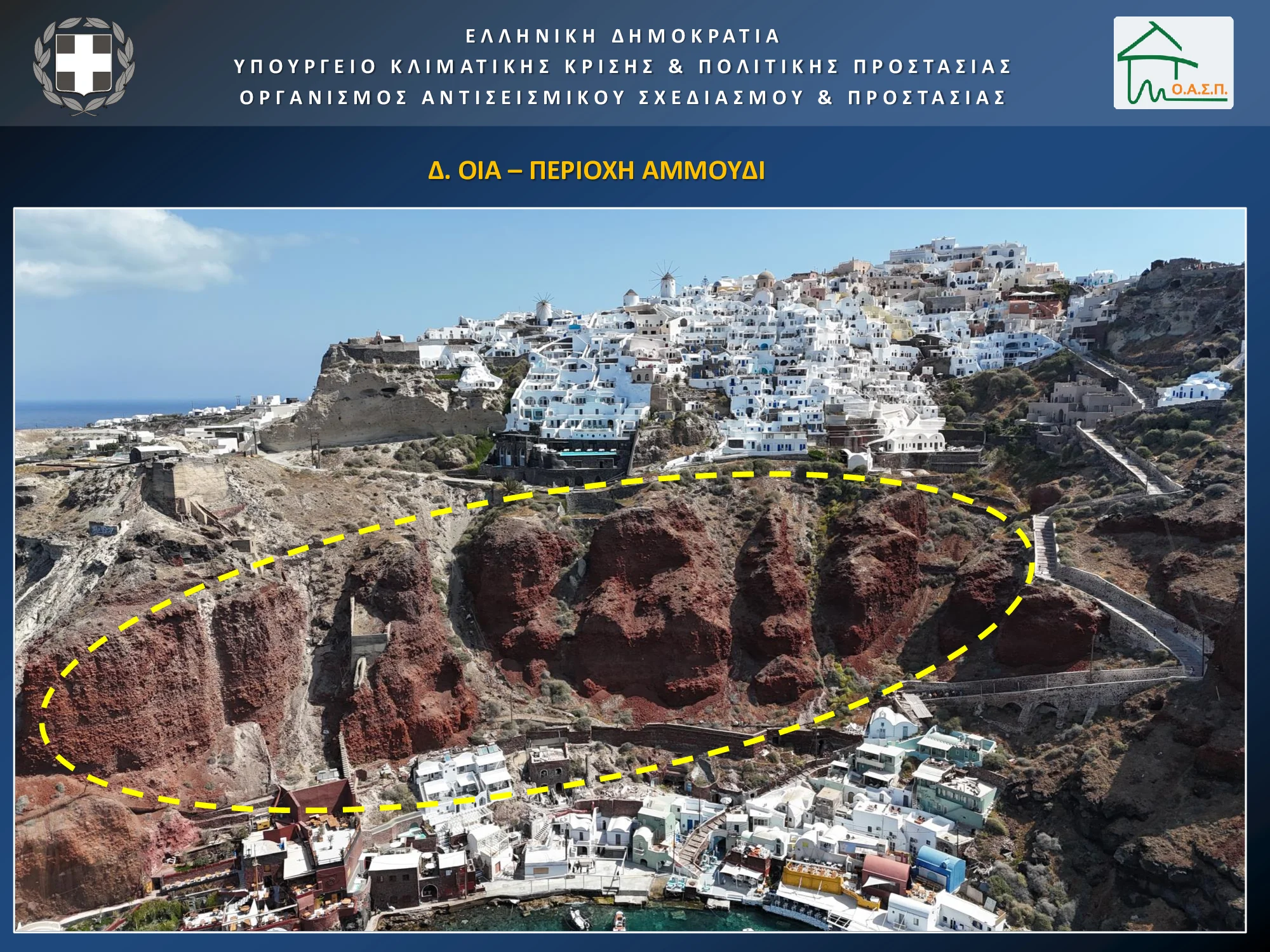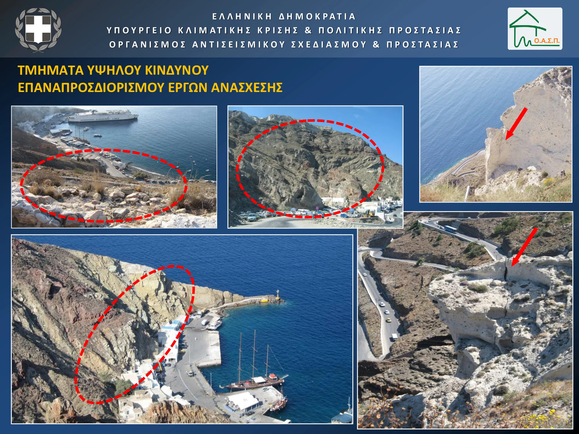 «Χαρτογραφήσαμε τον κατολισθητικό κίνδυνο και χαρτογραφήσαμε την κατολισθητική διακινδύνευση. Με βάση αυτά τα δεδομένα, επιλέξαμε πέντε περιοχές, οι οποίες συγκεντρώνουν υψηλή διακινδύνευση: Ο Παλαιός Λιμένας Φηρών, το Λιμάνι Αθηνιού και το οδικό δίκτυο του Όρμου, η Οία και συγκεκριμένα οι περιοχές Αμμούδι και Αρμένη και η Θηρασιά (οικισμός Κόρφου και ανάντι περιοχή, Μονοπάτι)».