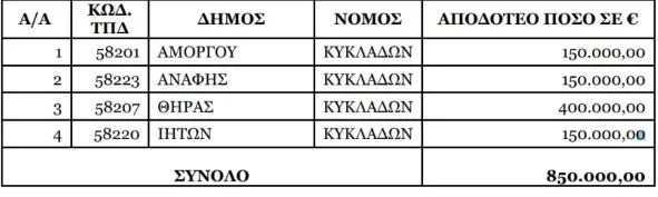 Σε Αμοργό, Ανάφη και Ίο δίνονται από 150.000 ευρώ και στον Δήμο Θήρας 400.000 ευρώ.