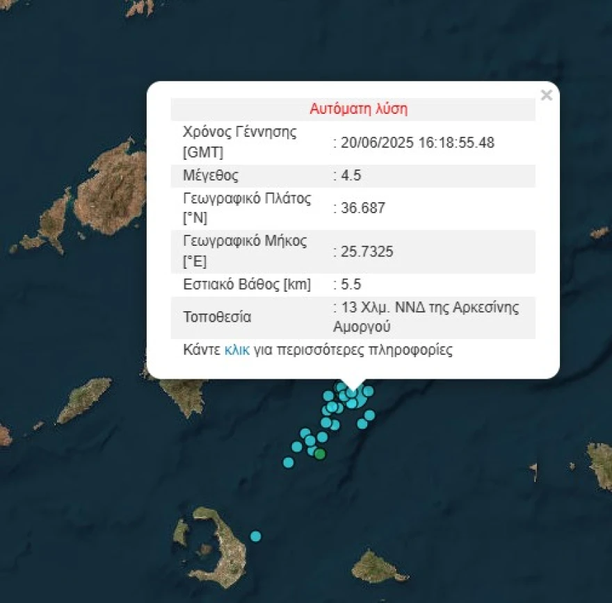 Σύμφωνα με την αυτόματη λύση του Γεωδυναμικού Ινστιτούτου, ο σεισμός σημειώθηκε 13 χιλιόμετρα νότια νοτιοδυτικά της Αρκεσίνης Αμοργού, ενώ το εστιακό βάθος υπολογίζεται στα 5,5 χιλιόμετρα.