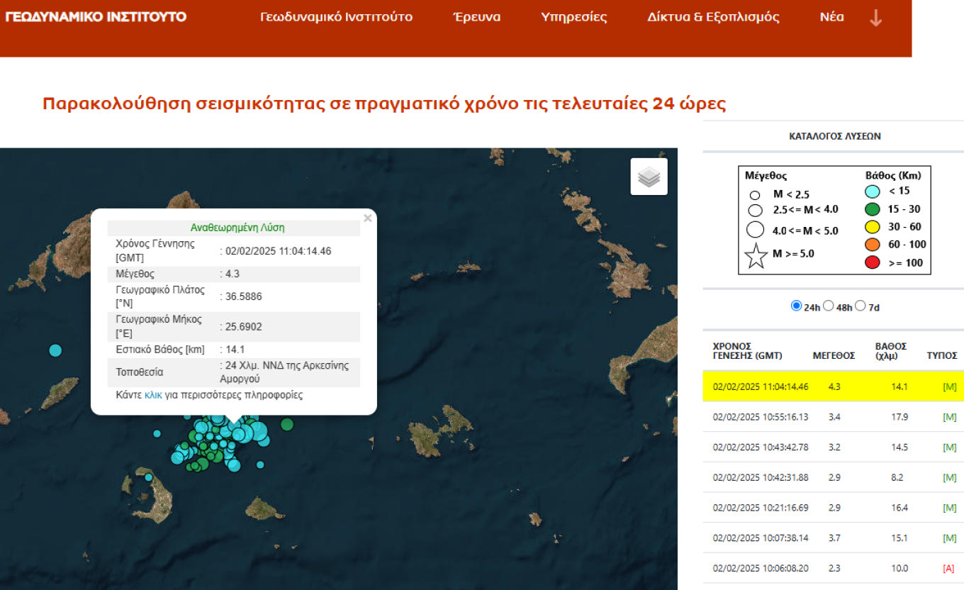 Νέος σεισμός μεγέθους 4,3 Ρίχτερ σημειώθηκε νωρίς το μεσημέρι της Κυριακής στην Αμοργό.