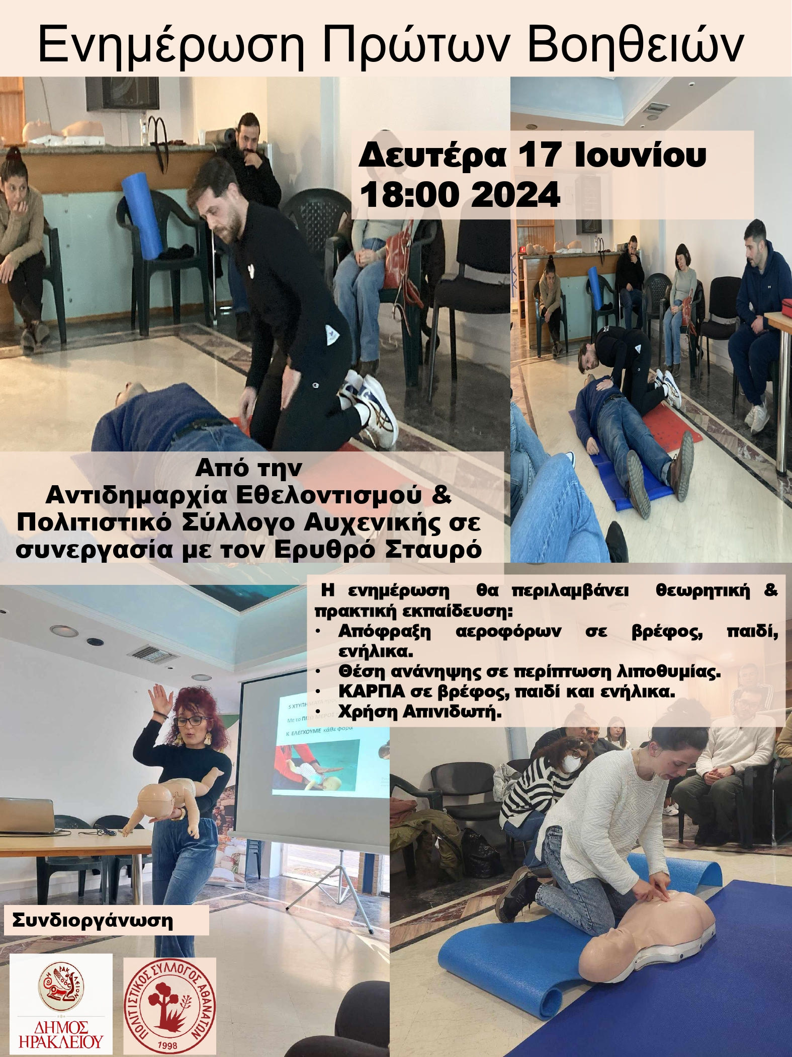 Στην Αυγενική θα πραγματοποιηθεί το επόμενο σεμινάριο Πρώτων Βοηθειών από την Αντιδημαρχία Εθελοντισμού και τον Δήμο Ηρακλείου, σε συνεργασία με τον Πολιτιστικό Σύλλογο Αυγενικής τη Δευτέρα 17 Ιουνίου στις 6 το απόγευμα.