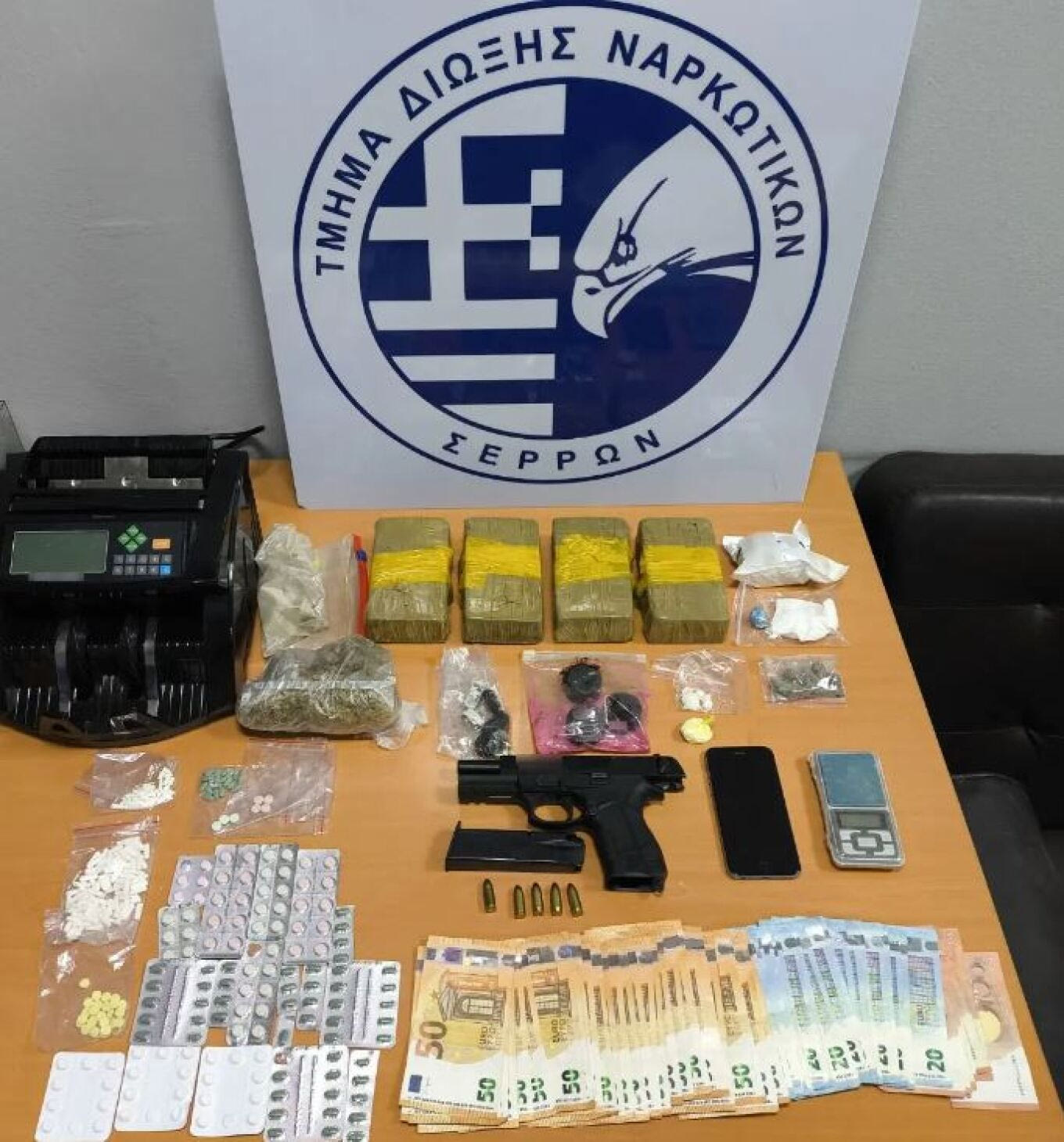 Ειδικότερα, μετά από συντονισμένες ενέργειες των αστυνομικών, εντοπίστηκε η προαναφερόμενη γυναίκα και σε έρευνα που έγινε στην οικία της, με τη συνδρομή και του αστυνομικού σκύλου ανίχνευσης ναρκωτικών ουσιών «Roxy» της Διεύθυνσης Αστυνομίας Σερρών, βρέθηκαν και κατασχέθηκαν: