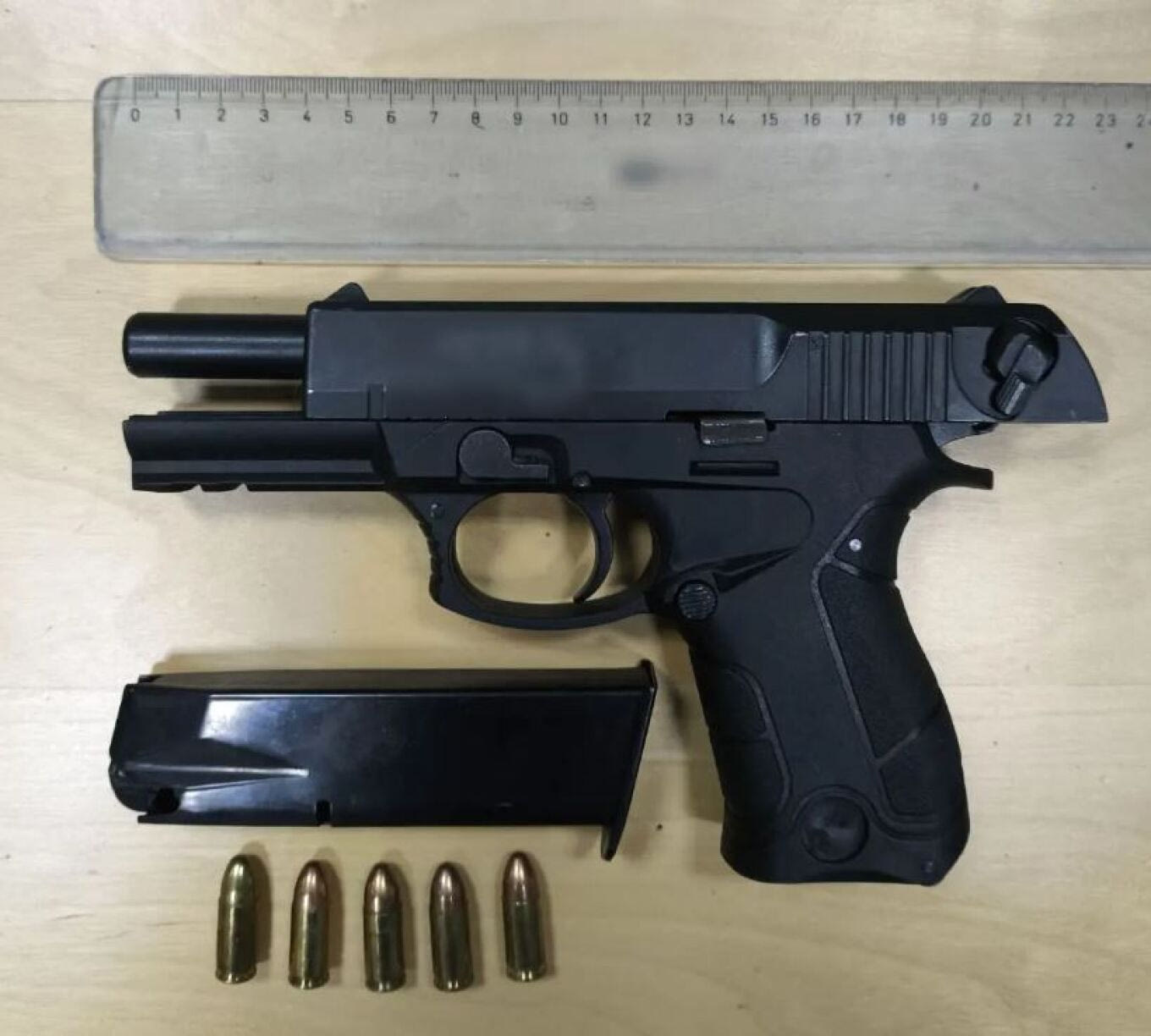 ένα πιστόλι, γεμιστήρας και 5 φυσίγγια των 9 χιλιοστών,