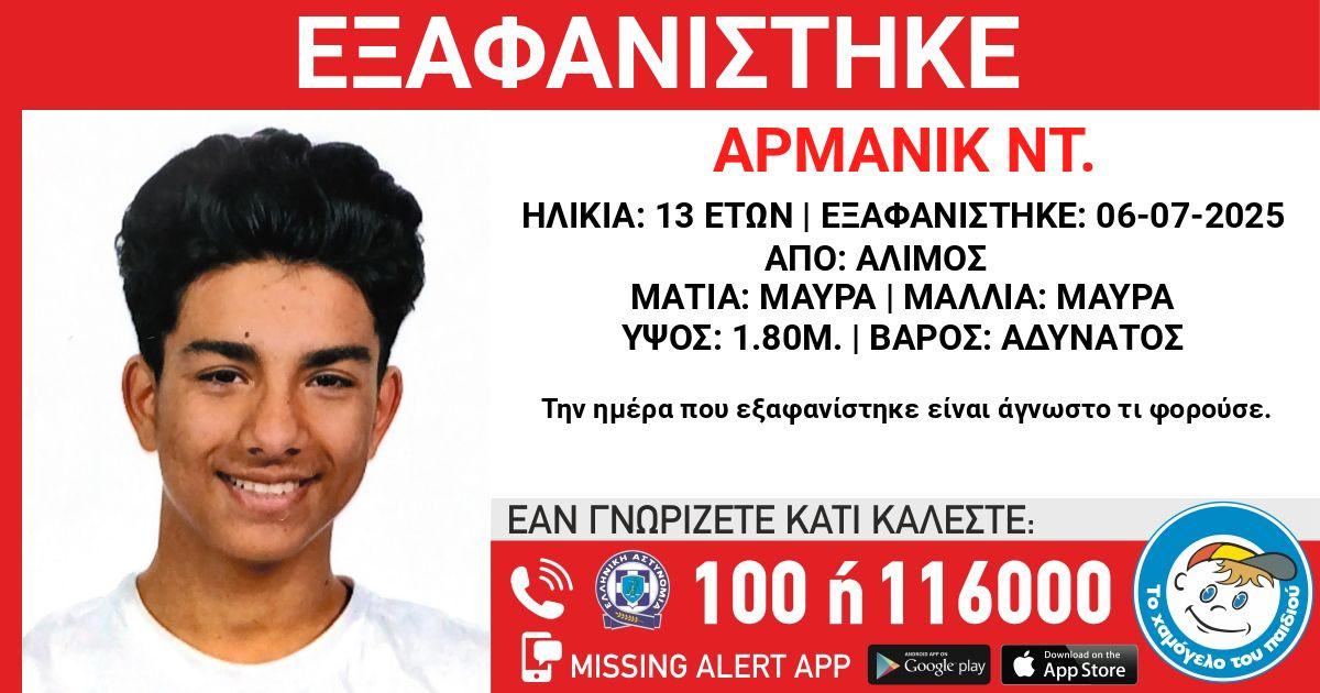 «Το Χαμόγελο του Παιδιού» ενημερώθηκε σήμερα 07/07/2025 για την εξαφάνιση του Αρμανίκ Ντ. και προχώρησε στη δημοσιοποίηση των στοιχείων του κατόπιν εισαγγελικής εντολής, καθώς ενδεχομένως να συντρέχουν λόγοι που θέτουν τη ζωή του σε κίνδυνο.