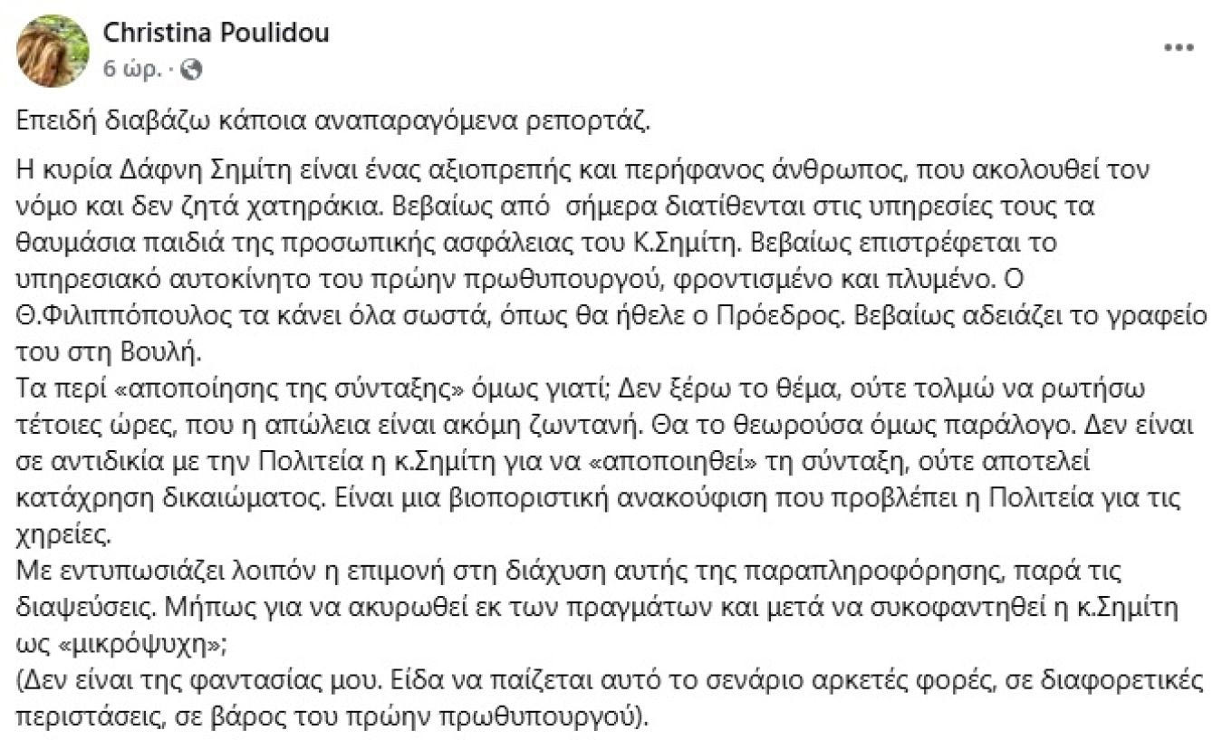 «Τα περί «αποποίησης της σύνταξης» γιατί; Δεν ξέρω το θέμα, ούτε τολμώ να ρωτήσω τέτοιες ώρες, που η απώλεια είναι ακόμη ζωντανή. Θα το θεωρούσα όμως παράλογο. Δεν είναι σε αντιδικία με την Πολιτεία η κυρία Σημίτη για να «αποποιηθεί» τη σύνταξη, ούτε αποτελεί κατάχρηση δικαιώματος. Είναι μια βιοποριστική ανακούφιση που προβλέπει η Πολιτεία για τις χηρείες», τονίζει η κυρία Πουλίδου λέγοντας για τη Δάφνη Σημίτη ότι «είναι ένας αξιοπρεπής και περήφανος άνθρωπος, που ακολουθεί το νόμο και δεν ζητά χατηράκια».