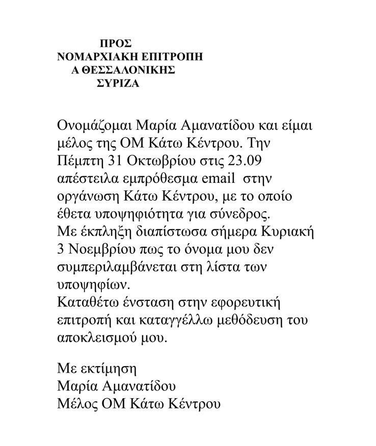 Αποκλεισμό της από τη σημερινή διαδικασία των εσωκομματικών εκλογών του ΣΥΡΙΖΑ- ΠΣ καταγγέλλει η σύζυγος του βουλευτή Α’ Θεσσαλονίκης, Χρήστου Γιαννούλη, Μαρία Αμανατίδου.