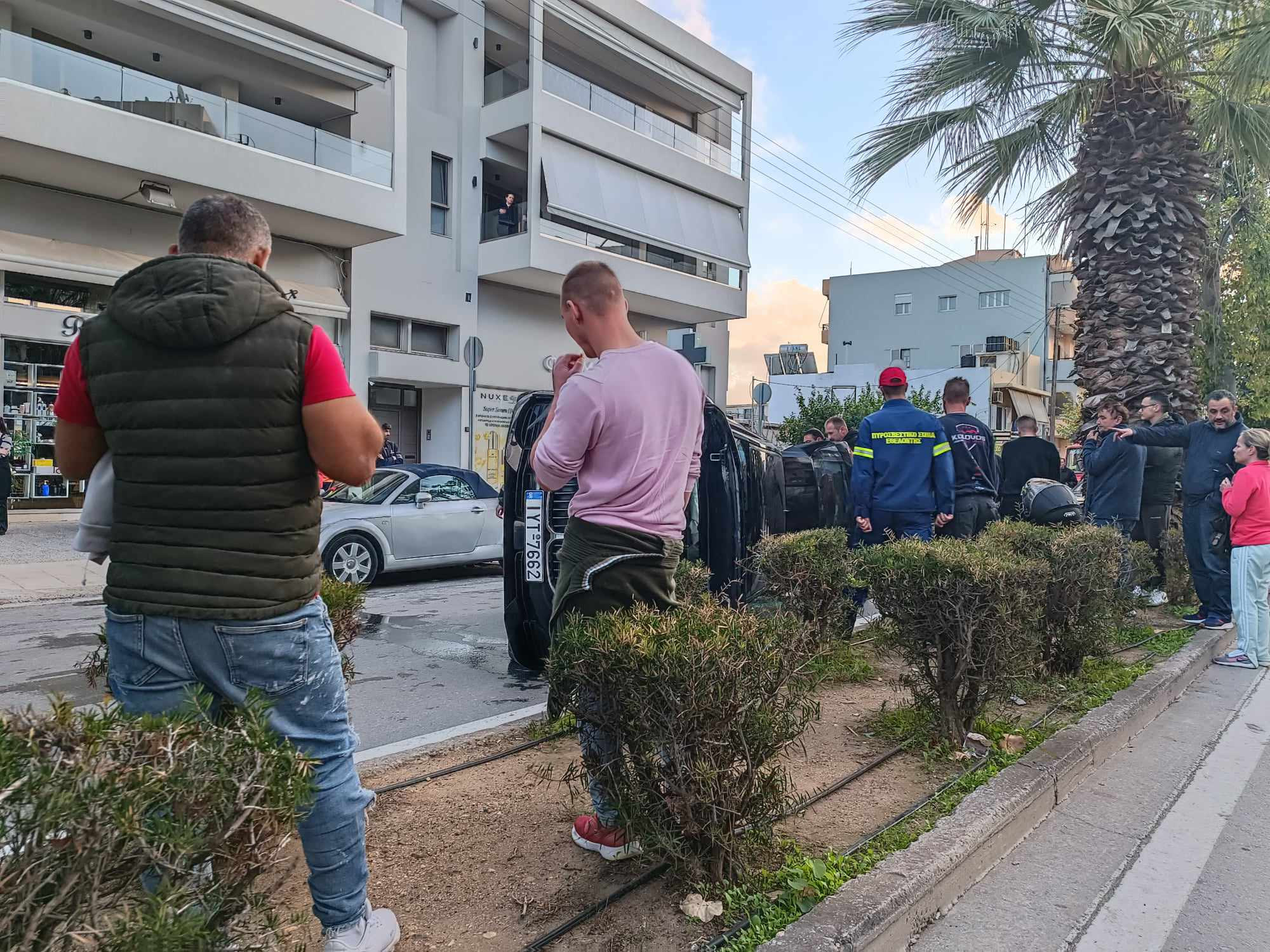 Ένα αυτοκίνητο αναποδογυρισμένο, μία γυναίκα εγκλωβισμένη, πυροσβέστες, ασθενοφόρο και αρκετοί περαστικοί που έκαναν το σταυρό τους συνθέτουν το σκηνικό του τροχαίου στη λ. Εθνικής Αντιστάσεως πριν από λίγο