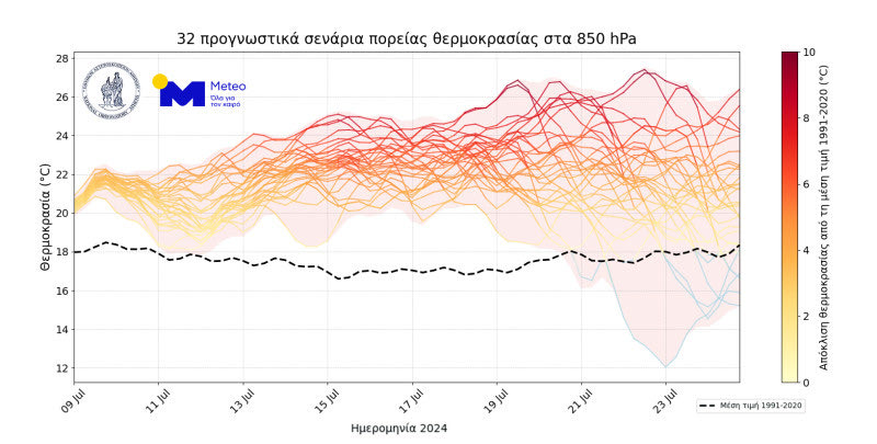 Χαρακτηριστικό των επόμενων ημερών θα είναι ότι η μέγιστη ημερήσια τιμή της θερμοκρασίας θα ξεπερνά καθημερινά τους 38-40 °C σε πολλές περιοχές της χώρας μας, φτάνοντας σε επίπεδα 6-8 °C πάνω από τις κανονικές για την εποχή τιμές.