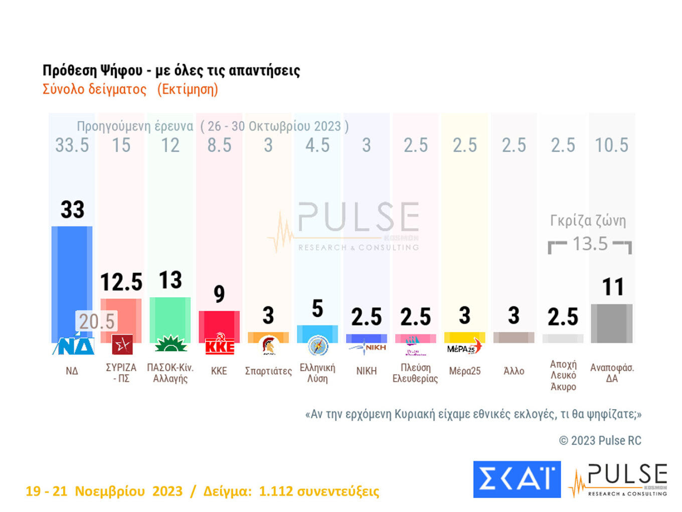 Παγιώνονται οι αλλαγές στις δυνάμεις των κομμάτων αφού για πρώτη φορά εμφανίζει και η Pulse το ΠΑΣΟΚ δεύτερο και τον ΣΥΡΙΖΑ στην τρίτη θέση, στην δημοσκόπηση που παρουσιάστηκε το βράδυ της Πέμπτης στο κεντρικό δελτίο του Σκάι. Πιο συγκεκριμένα, το κόμμα της αξιωματικής αντιπολίτευσης εμφανίζεται να χάνει 2,5 μονάδες μέσα σε 15 ημέρες, ενώ το ΠΑΣΟΚ κερδίζει μία, ανεβαίνοντας στην δεύτερη θέση, όπως έχουν ήδη δείξει οι μετρήσεις όλων των εταιρειών δημοσκοπήσεων.