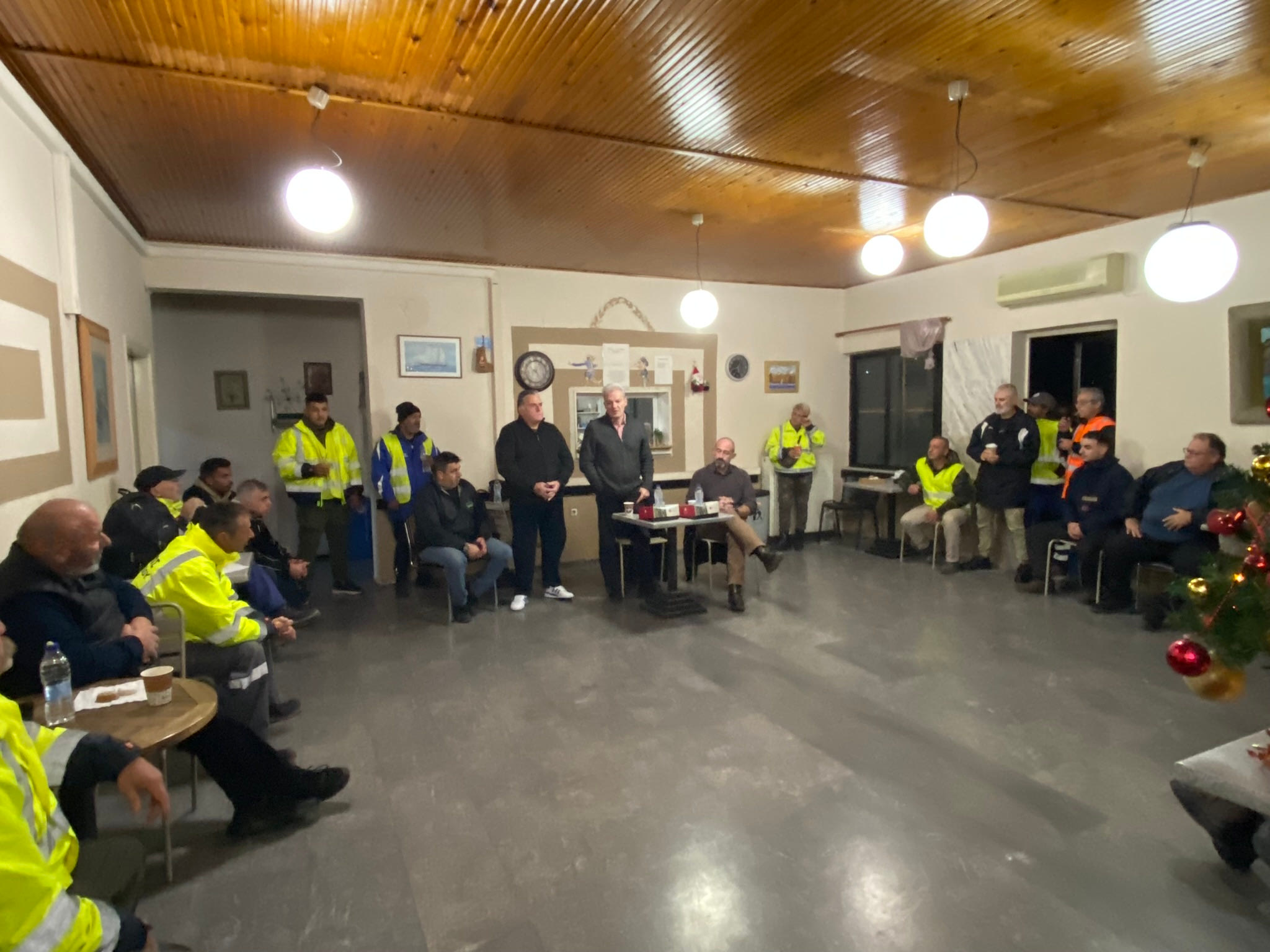 Το προσωπικό της Υπηρεσίας, λίγο πριν την έναρξη της βάρδιας, υποδέχθηκε με χαρά τον Δήμαρχο και τον Αντιδήμαρχο, με τον Πρόεδρο του Συλλόγου Μιχάλη Καρασσάβα να εκφράζει την ευχάριστη έκπληξη των εργαζομένων για αυτή την επίσκεψη, να τονίζει ότι όλοι θα είναι δίπλα στη Δημοτική Αρχή και να ζητάει υποστήριξη στα δίκαια αιτήματα των εργαζομένων.