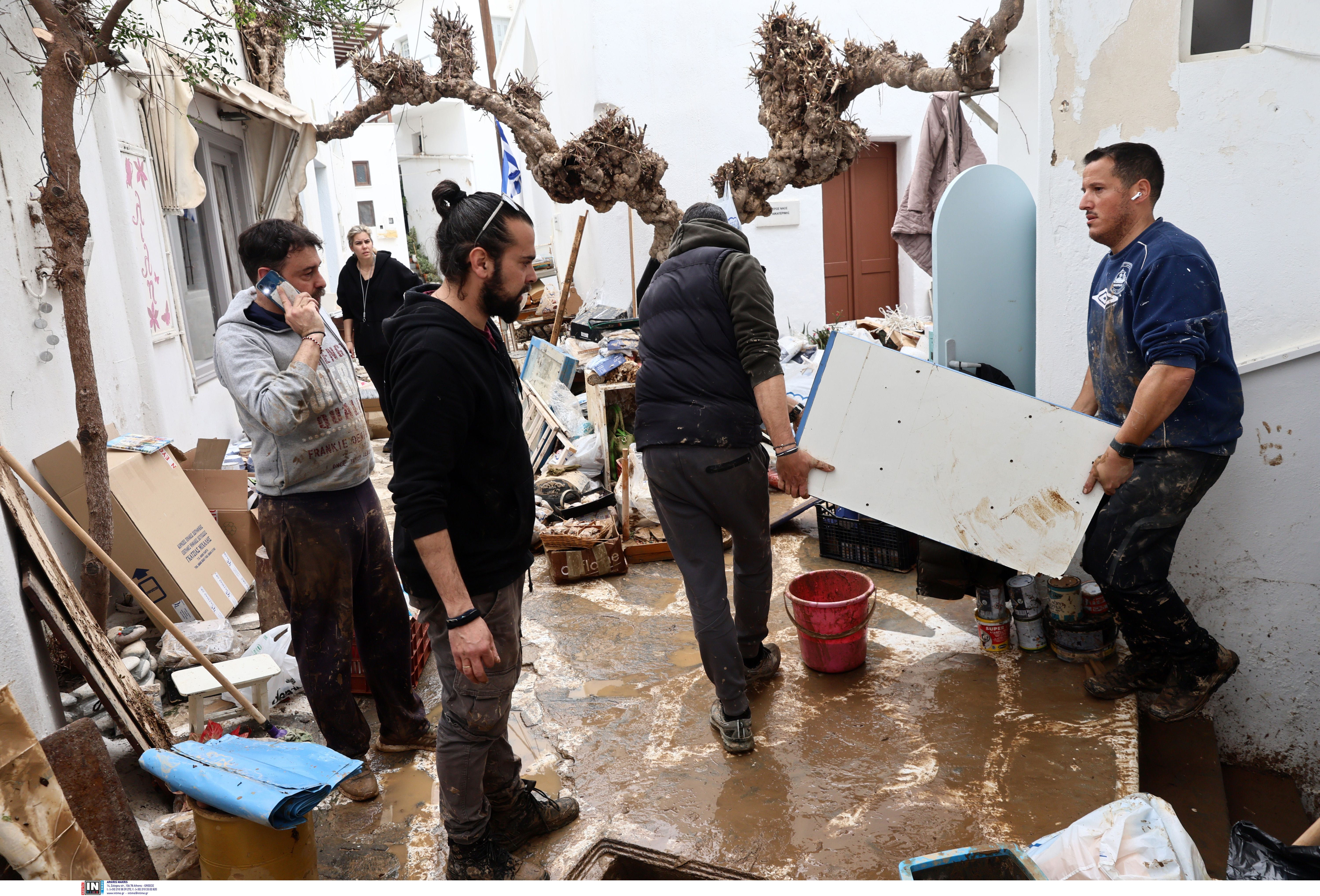 Αντιμέτωποι με τα νερά και τις λάσπες μέσα στις περιουσίες τους οι κάτοικοι του νησιού. Με φτυάρια και λάστιχα, αλλά και με μηχανήματα προσπαθούν να απομακρύνουν τα φερτά υλικά, αλλά και πέτρες. Μεγάλες είναι οι ζημιές στο οδικό δίκτυο, την ύδρευση και την ηλεκτροδότηση.