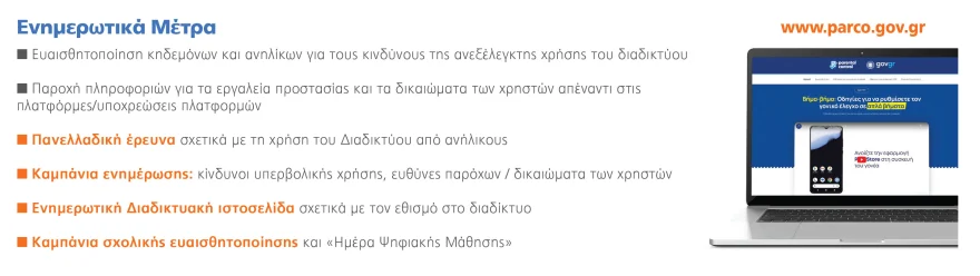 Η κυβέρνηση θα ανακοινώσει την προπαραμονή της Πρωτοχρονιάς τις τελικές αποφάσεις της για το ζήτημα, μετά την αναγνώριση ότι οι νεότερες γενιές στη χώρα μας έχουν έναν από τους υψηλότερους δείκτες διαδικτυακού εθισμού παγκοσμίως. Εως τότε θα έχει λειτουργήσει η ιστοσελίδα parco.gov.gr, όπου οι γονείς θα μπορούν να βρουν εύληπτες οδηγίες ώστε να αξιοποιήσουν τους γονικούς ελέγχους που διαθέτουν προεγκατεστημένους τα περισσότερα κινητά, όπως και η εφαρμογή Kids Wallet, η οποία, μεταξύ άλλων, θα επιτρέπει την αυτόματη πιστοποίηση της ηλικίας του χρήστη.