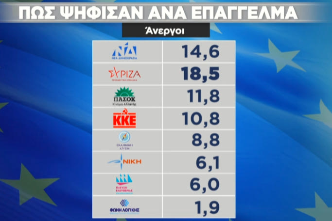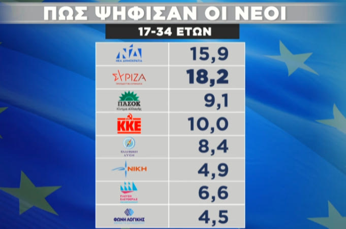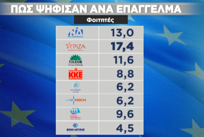 ΣΥΡΙΖΑ και ΠΑΣΟΚ δεν ενίσχυσαν τα ποσοστά τους στους νέους, ενδεχομένως μειώθηκαν και κατά τι σχολίασε ο Γιώργος Αράπογλου. Παράλληλα, δεν φαίνεται να προκύπτει μετακίνηση ηλικιακής ομάδας, κάποιου πολιτικού χώρου ή κάποιου επαγγέλματος από τη ΝΔ προς τα δυο άλλα κόμματα της αντιπολίτευσης. Η μείωση των ποσοστών της ΝΔ σε όλες τις ομάδες που εμφανίζονται χωριστά στους πίνακες είναι ομοιόμορφη, δηλαδή δεν φαίνεται σε κάποια ομάδα η ΝΔ να χάνει πιο μεγάλο ποσοστό απ’ ό,τι στην άλλη.