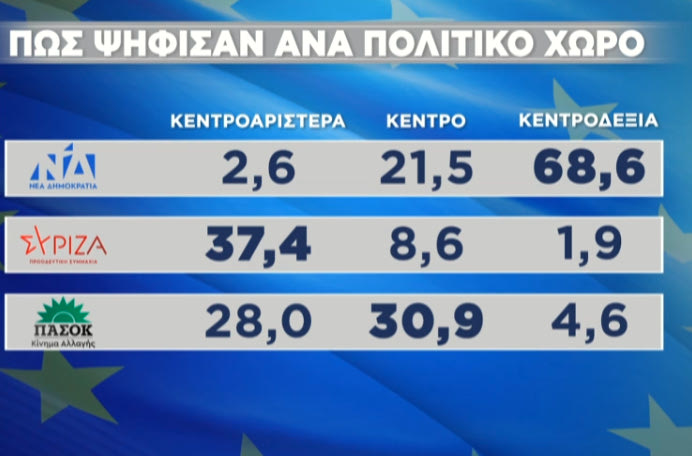 Το ΠΑΣΟΚ παίρνει τα σκήπτρα στο χώρο του κέντρου, ενώ η ΝΔ κυριαρχεί στους κεντροδεξιούς και ο ΣΥΡΙΖΑ στους κεντροαριστερούς. «Η ΝΔ έχασε αξιόλογο ποσοστό στον κεντρώο χώρο, ενδεχομένως οι κεντρώοι ψηφοφόροι επέλεξαν σε μεγαλύτερο βαθμό την αποχή, και όχι τη μετακίνηση σε κάποιο από τα δύο άλλα κόμματα της αντιπολίτευσης» σχολίασε ο κ. Αράπογλου.