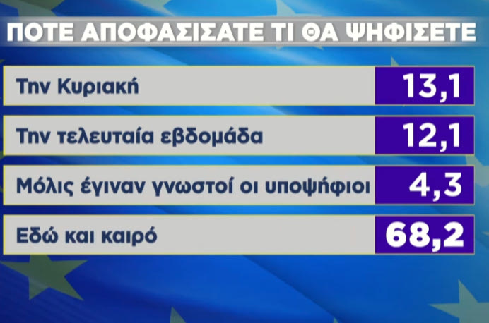 Αναποφάσιστοι μέχρι τελευταία στιγμήΣημειώνεται ότι ανήμερα των εκλογών το 13,1% πήρε απόφαση τι θα ψηφίσει κάτι που δυσκολεύει και την πρόβλεψη της συμπεριφοράς τους στις δημοσκοπήσεις, κάτι που είχε επισημανθεί ως «γκρίζα ζώνη» στη δημοσκόπηση της Pulse.