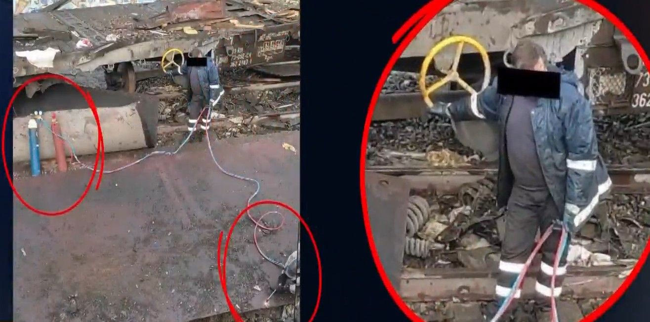 Στη φωτογραφία φαίνονται εργάτες να κόβουν με οξυγόνο τμήμα της πλατφόρμας της εμπορικής αμαξοστοιχίας προκειμένου να στοιβαχτεί κομμάτι κομμάτι σε φορτηγό και να μεταφερθεί στο Κουλούρι.