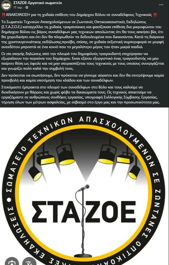 «Χυδαία, τραμπούκικη και φασίζουσα επίθεση δια μικροφώνου» χαρακτηρίζει το Σωματείο Τεχνικών Απασχολούμενων σε Ζωντανές Οπτικοακουστικές Εκδηλώσεις (ΣΤΑΖΟΕ) την επίθεση που δέχθηκαν οι τεχνικοί από τον δήμαρχο Βόλου Αχιλλέα Μπέο, το βράδυ της Τρίτης 3 Δεκεμβρίου, στη χριστουγεννιάτικη γιορτή που τραγούδησε ο Κωνσταντίνος Αργυρός.