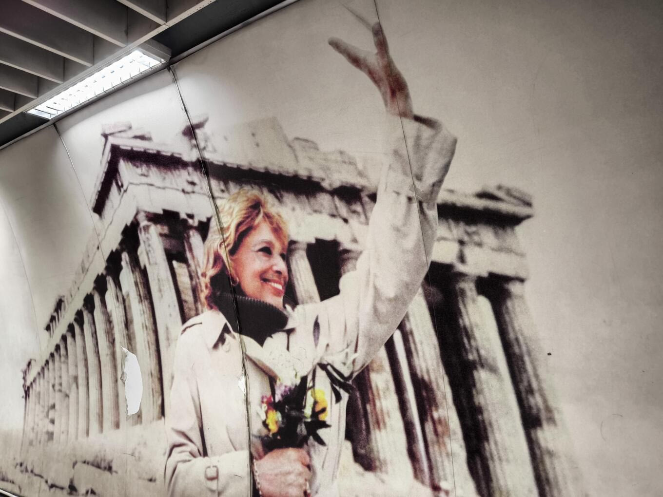 Η φωτογραφία απεικονίζει την υπουργό Πολιτισμού επί κυβερνήσεων Ανδρέα Παπανδρέου να χαιρετά χαμογελαστή πάνω στον Ιερό Βράχο της Ακρόπολης, κρατώντας ένα μπουκέτο λουλούδια. Τοποθετήθηκε στον σταθμό του Μετρό από την αρχή της δημιουργίας του, αποτίοντας φόρο τιμής στις προσπάθειες της Μελίνας Μερκούρη ιδιαιτέρως για την επανένωση των Γλυπτών του Παρθενώνα.