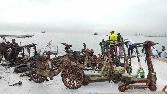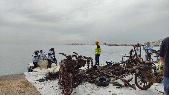Περισσότερα από 15 ηλεκτρικά πατίνια, αρκετά ποδήλατα αλλά και κινητά έβγαλαν από τη θάλασσα οι εθελοντές δύτες που καθάρισαν τα νερά της παραλίας του Θερμαϊκού σήμερα Τρίτη στη Θεσσαλονίκη.