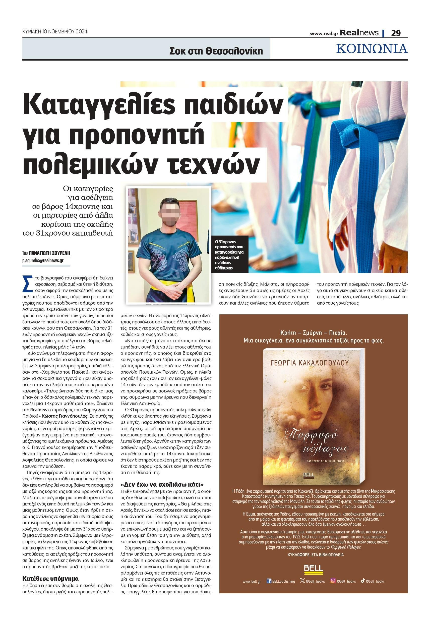 Οι κατηγορίες για ασέλγεια σε βάρος 14χρονης και οι μαρτυρίες από άλλα κορίτσια της σχολής 31χρονου στη Θεσσαλονίκη. Στο βιογραφικό του αναφέρει ότι δείχνει αφοσίωση, σεβασμό και θετική διάθεση, όσον αφορά την ενασχόλησή του με τις πολεμικές τέχνες. Όμως, σύμφωνα με τις κατηγορίες που του αποδίδονται σήμερα από την Αστυνομία, εκμεταλλεύτηκε με τον χειρότερο τρόπο την εμπιστοσύνη των γονιών, οι οποίοι έστελναν τα παιδιά τους στη σχολή όπου διδάσκει κουνγκ φου στη Θεσσαλονίκη. Για τον 31 ετών προπονητή πολεμικών τεχνών σχηματίζεται δικογραφία για ασέλγεια σε βάρος αθλήτριάς του, ηλικίας μόλις 14 ετών.