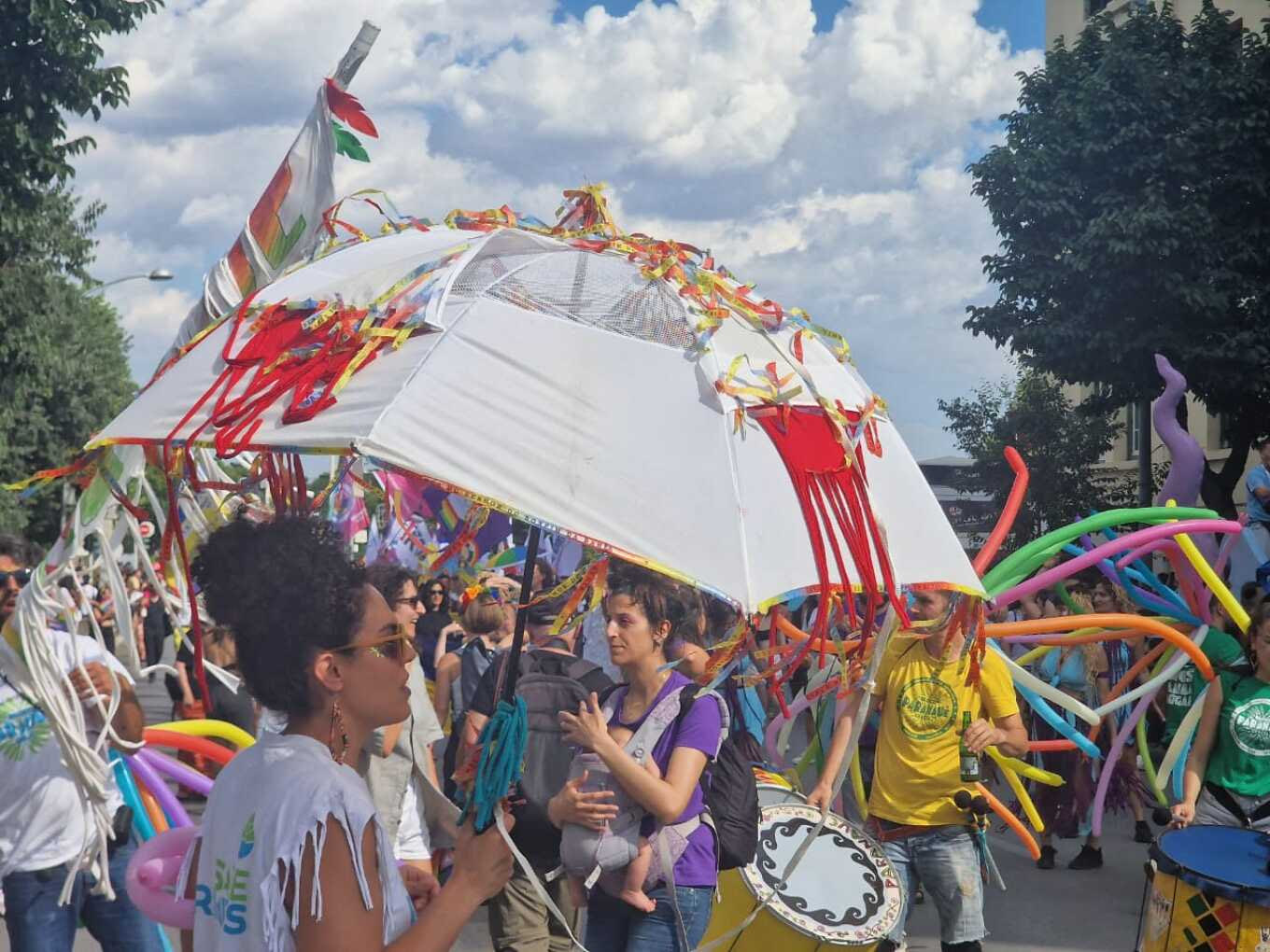 Στην κεφαλή της πορείας βρίσκεται η πολύχρωμη σημαία του pride ενώ ακολουθούν άρματα με τους ανθρώπους πάνω σε αυτά να χορεύουν στους ρυθμούς της μουσικής.