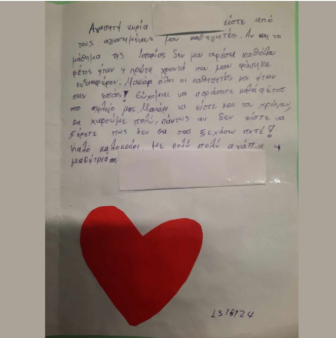 «Αγαπητή κυρία είστε από τους αγαπημένους μου καθηγητές. Αν και το μάθημα της ιστορίας δε μου αρέσει καθόλου, φέτος ήταν η πρώτη χρονιά που μου φάνηκε ενδιαφέρον. Μακάρι όλοι οι καθηγητές να ήταν σαν εσάς! Εύχομαι να περάσατε καλά φέτος στο σχολείο μας. Μακάρι να είστε και του χρόνου, θα χαρούμε πολύ, πάντως αν δεν είστε να ξέρετε πως δε θα σας ξεχάσω ποτέ! Καλό καλοκαίρι με πολύ πολύ αγάπη η μαθήτρια σας» είναι το σημείωμα που άφησε στην αγαπημένη της καθηγήτρια, δύο εβδομάδες πριν χάσει τη ζωή της.