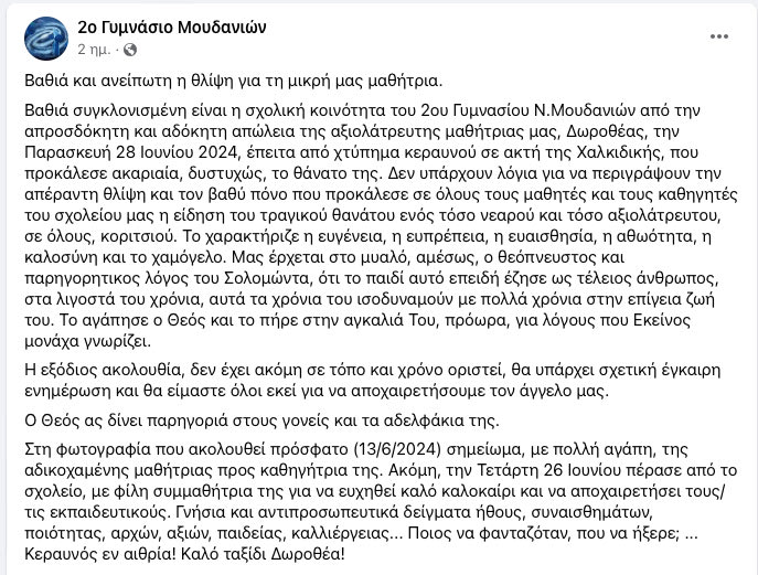 «Βαθιά και ανείπωτη η θλίψη για τη μικρή μας μαθήτρια. Βαθιά συγκλονισμένη είναι η σχολική κοινότητα του 2ου Γυμνασίου Ν. Μουδανιών από την απροσδόκητη και αδόκητη απώλεια της αξιολάτρευτης μαθήτριάς μας, Δωροθέας, την Παρασκευή 28 Ιουνίου 2024, έπειτα από χτύπημα κεραυνού σε ακτή της Χαλκιδικής, που προκάλεσε ακαριαία, δυστυχώς, το θάνατο της. Δεν υπάρχουν λόγια για να περιγράψουν την απέραντη θλίψη και τον βαθύ πόνο που προκάλεσε σε όλους τους μαθητές και τους καθηγητές του σχολείου μας η είδηση του τραγικού θανάτου ενός τόσο νεαρού και τόσο αξιολάτρευτου, σε όλους, κοριτσιού. Το χαρακτήριζε η ευγένεια, η ευπρέπεια, η ευαισθησία, η αθωότητα, η καλοσύνη και το χαμόγελο» αναφέρει στην ανάρτησή του, το σχολείο όπου πήγαινε η άτυχη μαθήτρια.