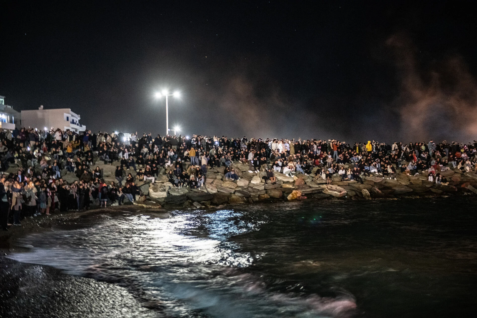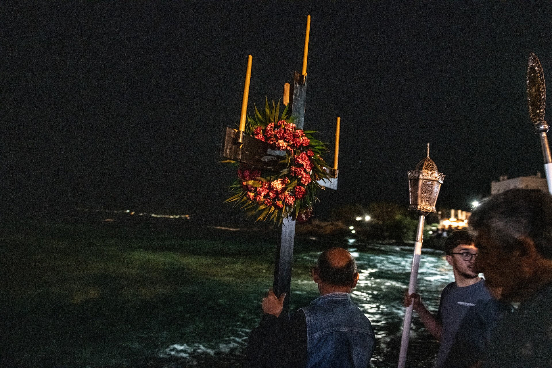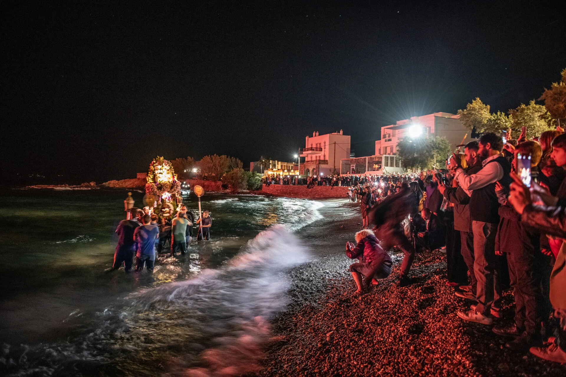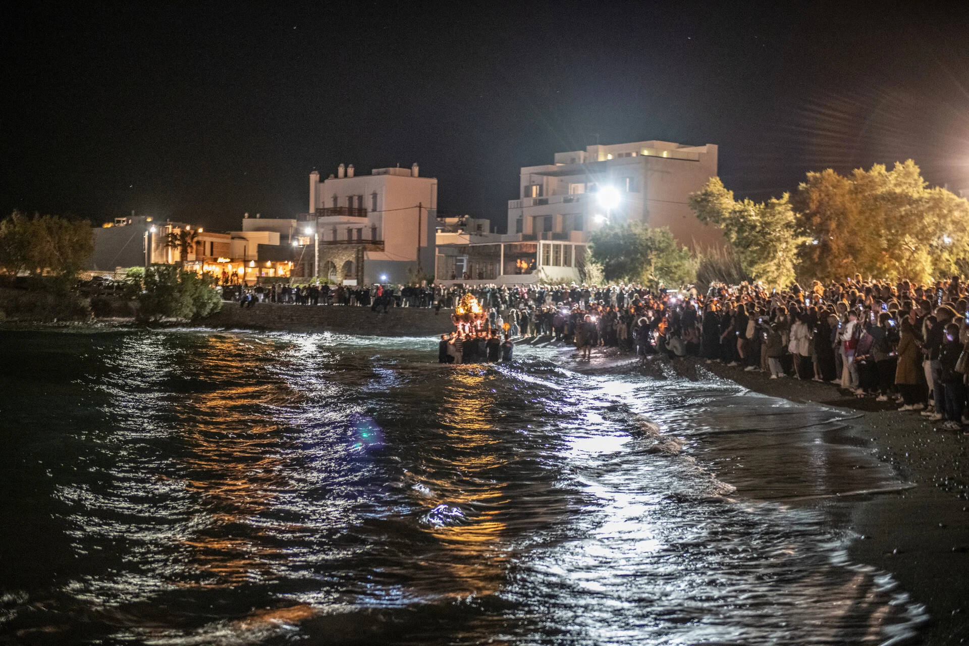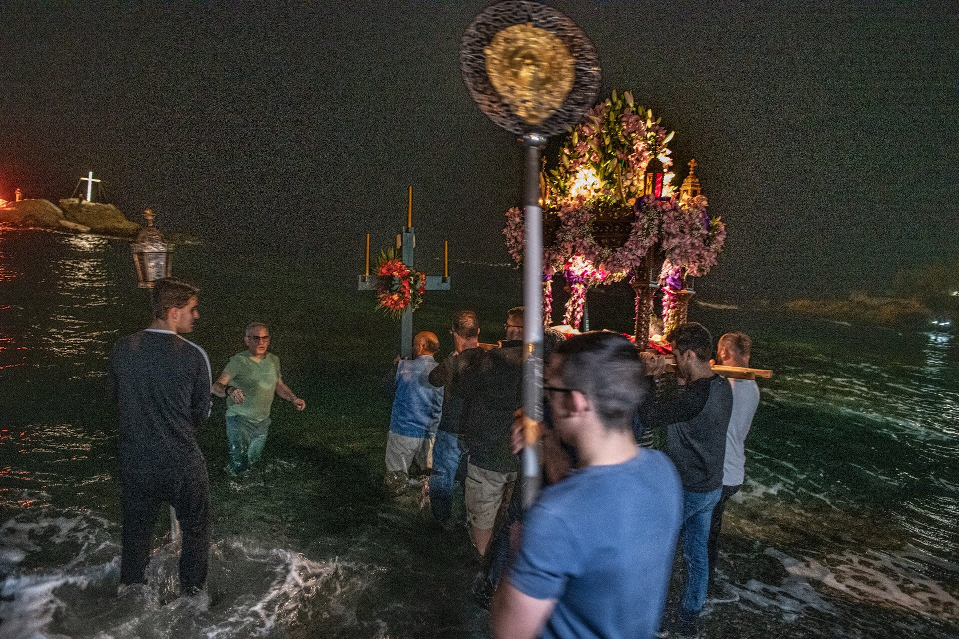 Στην συνέχεια, ο Επιτάφιος του Αγίου Νικολάου αποχωρεί από την εξέδρα και προχωράει προς στην παραλία «Καλάμια», όπου μπαίνει μέσα με αναμμένους πυρσούς και φλεγόμενο Σταυρό. Μια ιδιαίτερη στιγμή, προς τιμήν για εκείνους που έχουν πνιγεί ή χαθεί στην θάλασσα τα προηγούμενα χρόνια. Να αναφέρουμε επίσης, ότι μαζί με τον Επιτάφιο μπαίνει και ο ιερέας μέσα.