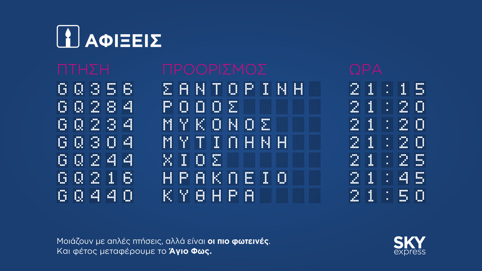 Όπως αναφέρεται σε ανακοίνωση της εταιρείας, «για άλλη μία χρονιά η SKY express, πιστή στις αξίες, τα ήθη και τα έθιμα της χώρας, θα μεταφέρει το Άγιο Φως, της ελπίδας και της αγάπης σε κάθε γωνιά της Ελλάδας και συγκεκριμένα στο Ηράκλειο, τη Ρόδο, τη Μύκονο, τη Μυτιλήνη, τη Σαντορίνη, τη Χίο και τα Κύθηρα, έχοντας θέσει και φέτος τους ανθρώπους, αλλά και τα ολοκαίνουργια αεροσκάφη της στη διάθεση της ελληνικής Πολιτείας”.
