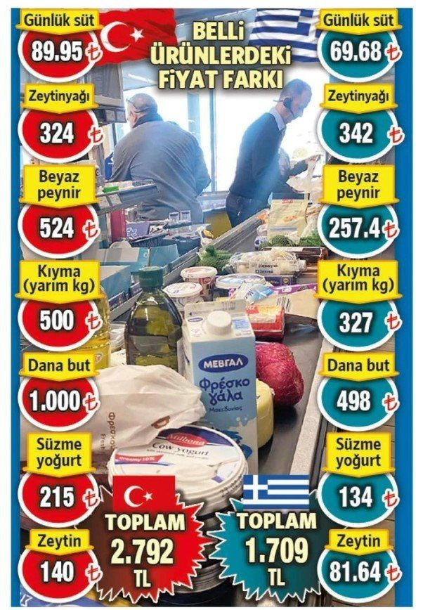 Το ίδιο καλάθι προϊόντων που στην Τουρκία κοστίζει 3.709 τουρκικές λίρες (περίπου 72 ευρώ), στην Ελλάδα διαμορφώθηκε στις 2.433 λίρες (περίπου 47 ευρώ), επιβεβαιώνοντας τη σημαντική διαφορά τιμών.