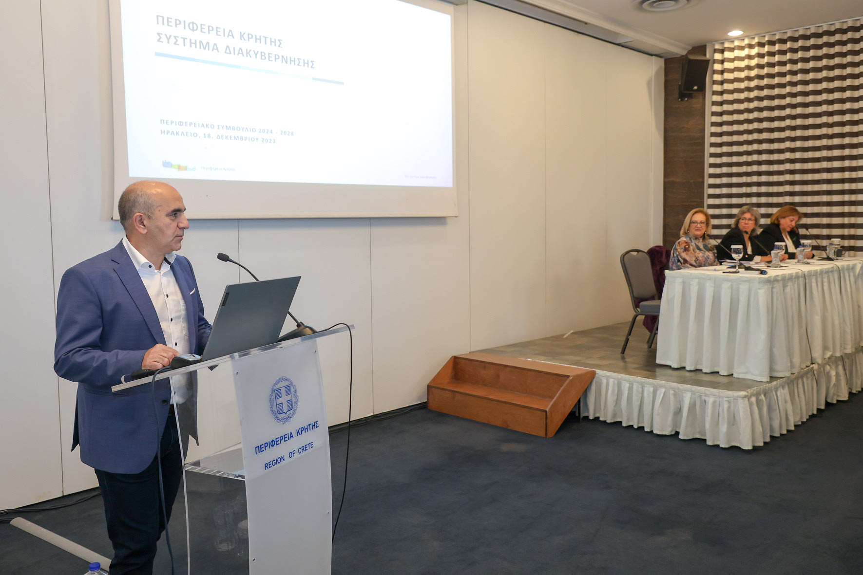 Ο Περιφερειάρχης στην σύντομη ομιλία του προς τους αιρετούς υπογράμμισε πως προτεραιότητα όλων πρέπει να είναι τα προβλήματα των πολιτών, κριτήριο και στόχος των ενεργειών να είναι η ισόρροπη ανάπτυξη της Κρήτης και να υπάρχει συνεννόηση και συνεργασία με τις αρμόδιες υπηρεσίες, για να προχωρεί το έργο και ο σχεδιασμός της Περιφέρειας Κρήτης.