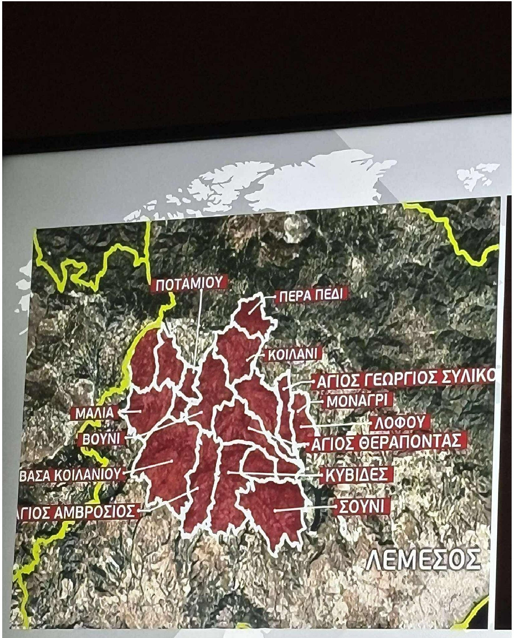 Σύμφωνα με το alphanews, στο έλεος της πύρινης λαίλαπας βρέθηκαν οι κοινότητες Μαλιά, Όμοδος, Βάσα, Άρσος, Ποταμιού, Λόφου, Άγιος Γεώργιος Συλίκου, Βουνί, Άγιος Αμβρόσιος, Κυβίδες, Σούνι, Καντού. Μέχρι τη δύση του ηλίου, επιχειρούσαν από αέρος 14 πτητικά μέσα, ενώ οι επίγειες δυνάμεις συνεχίζουν τη μάχη καθ’ όλη τη διάρκεια της νύχτας. Με το πρώτο φως της ημέρας, αναμένεται να σηκωθούν ξανά τα εναέρια μέσα για να ενισχύσουν την κατάσβεση.