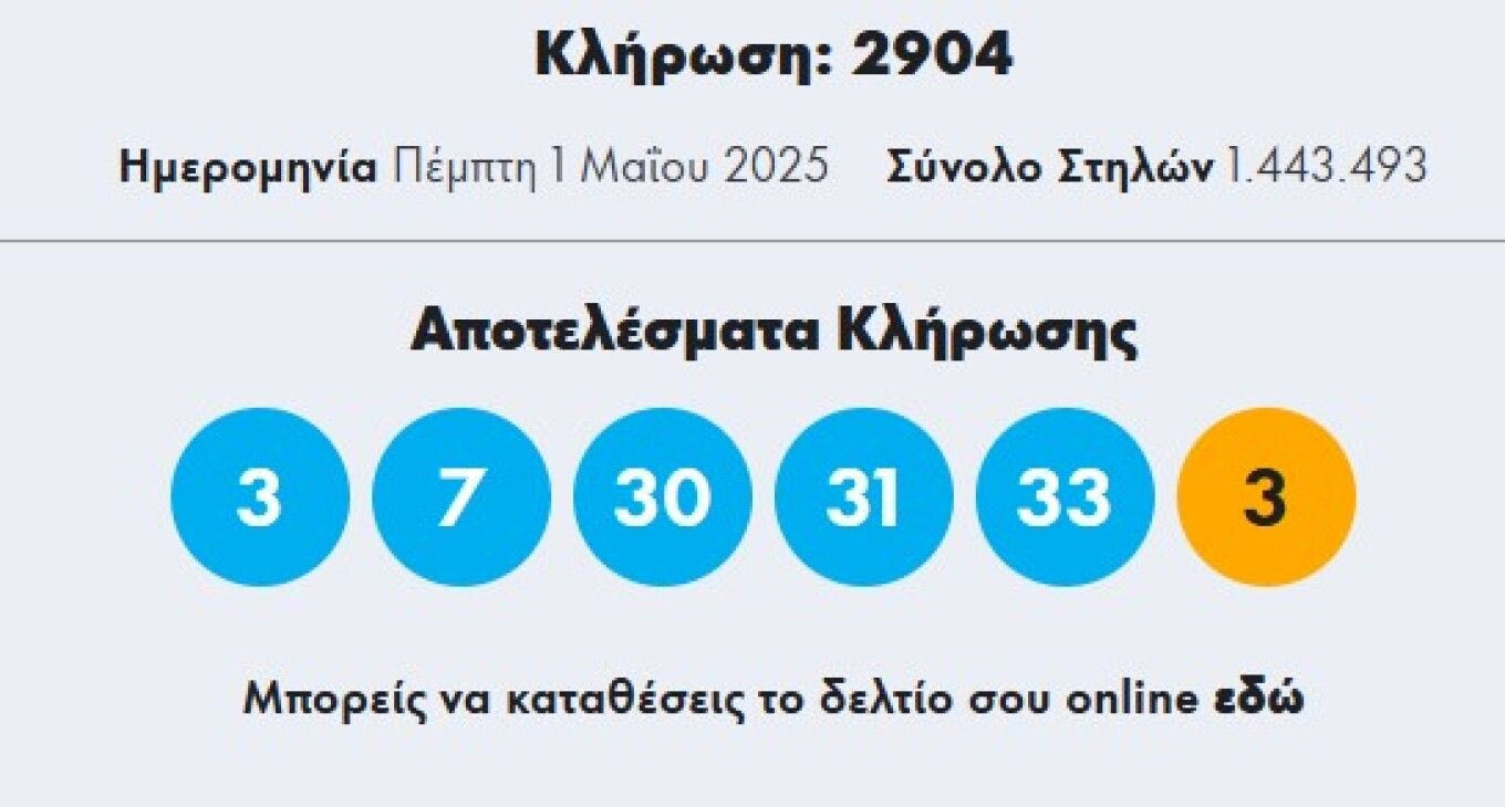 Οι τυχεροί αριθμοί που ανέδειξε η αποψινή κλήρωση είναι οι: 3,7, 30, 31, 33 και Τζόκερ το 3.